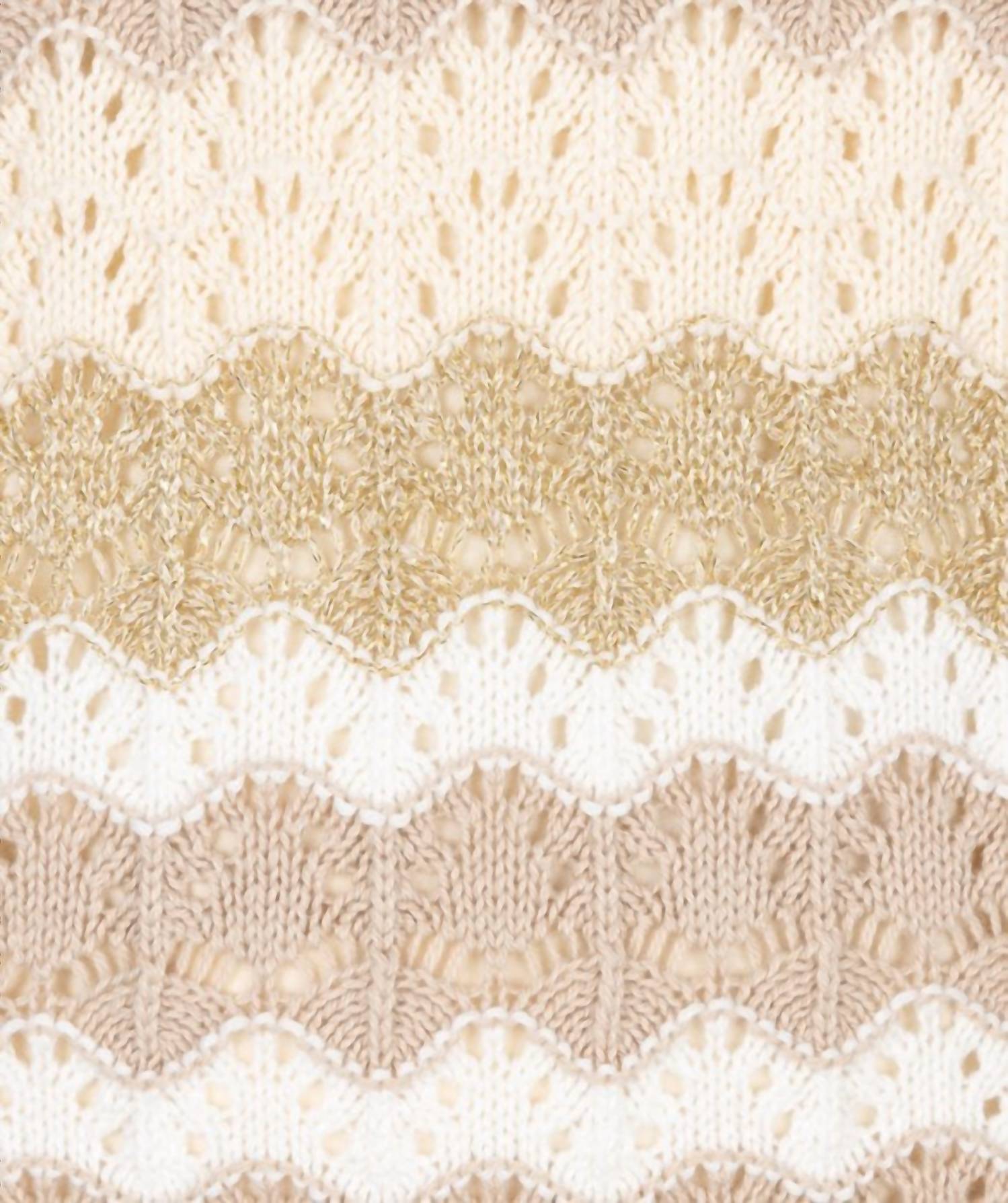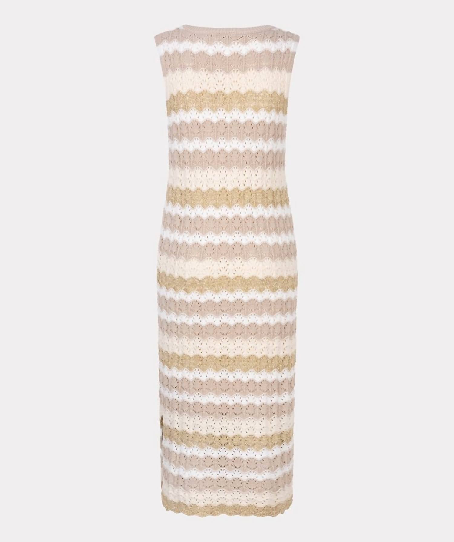 Introducing the Esqualo Ajour Stripe Knit Dress, a playful and whimsical addition to your wardrobe. This sleeveless, shift silhouette dress is crafted from a unique cotton blend, combining 82% cotton, 15% acrylic, and 2% polyester for a slight stretch. The dress is midi in length with a striking stripe crochet design interwoven with lurex and features a stylish slit on the left side. It is a pull-on style originating from Esqualo, perfect for summer outings or travel. Care is simple: hand wash and lay flat to dry.