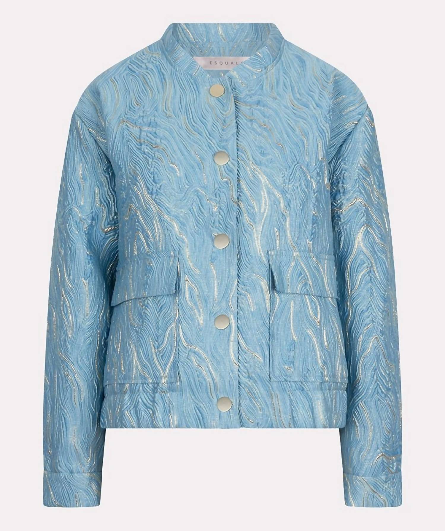 A riff on your favorite classic bomber jacket. Elevate your wardrobe with the ESQUALO Bomber Jacket, a stunning piece in blue with a unique tie-dye pattern that commands attention. Designed with long sleeves and crafted from 85% Polyester and 15% Lurex, this jacket showcases a gold marble effect perfect for chic styling with gold jewelry. It features convenient front flap pockets and a luxurious gold button closure. Made in China, this boho chic winter essential requires dry cleaning.