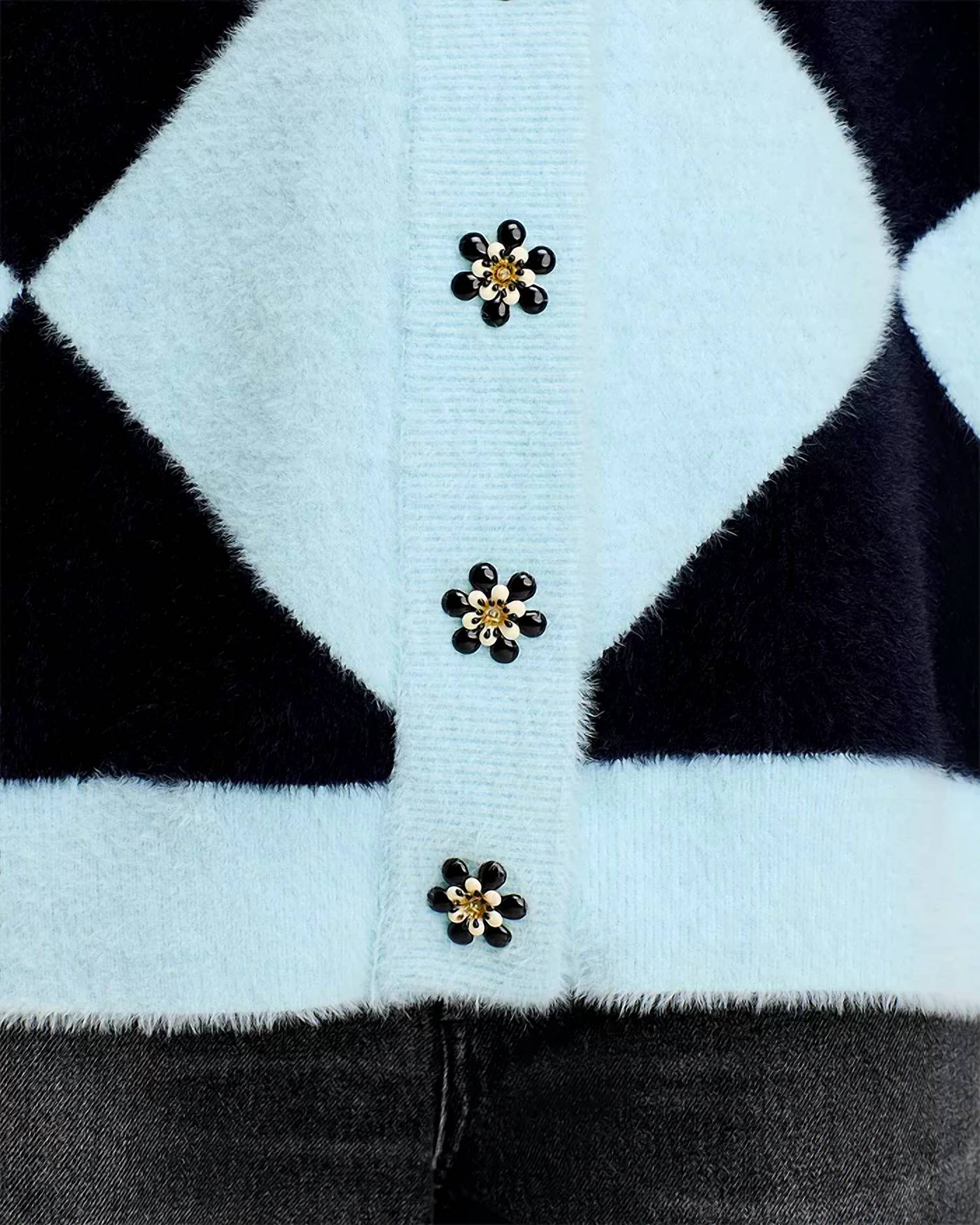A classic fit that works just as good buttoned as it does left open. The How Cozy Cardigan by ESSENTIAL ANTWERP is the ultimate winter essential with its long sleeves and heavyweight knit, perfect for adding warmth and style. Crafted entirely from 100% polyamide, this bel air colored cardigan showcases a playful harlequin geometric pattern. Its design features dropped shoulders and ribbed trims for a structured, yet laid-back look, complete with flower-shaped snap buttons for a unique touch. Closure: Button closure. Care: Hand wash only.