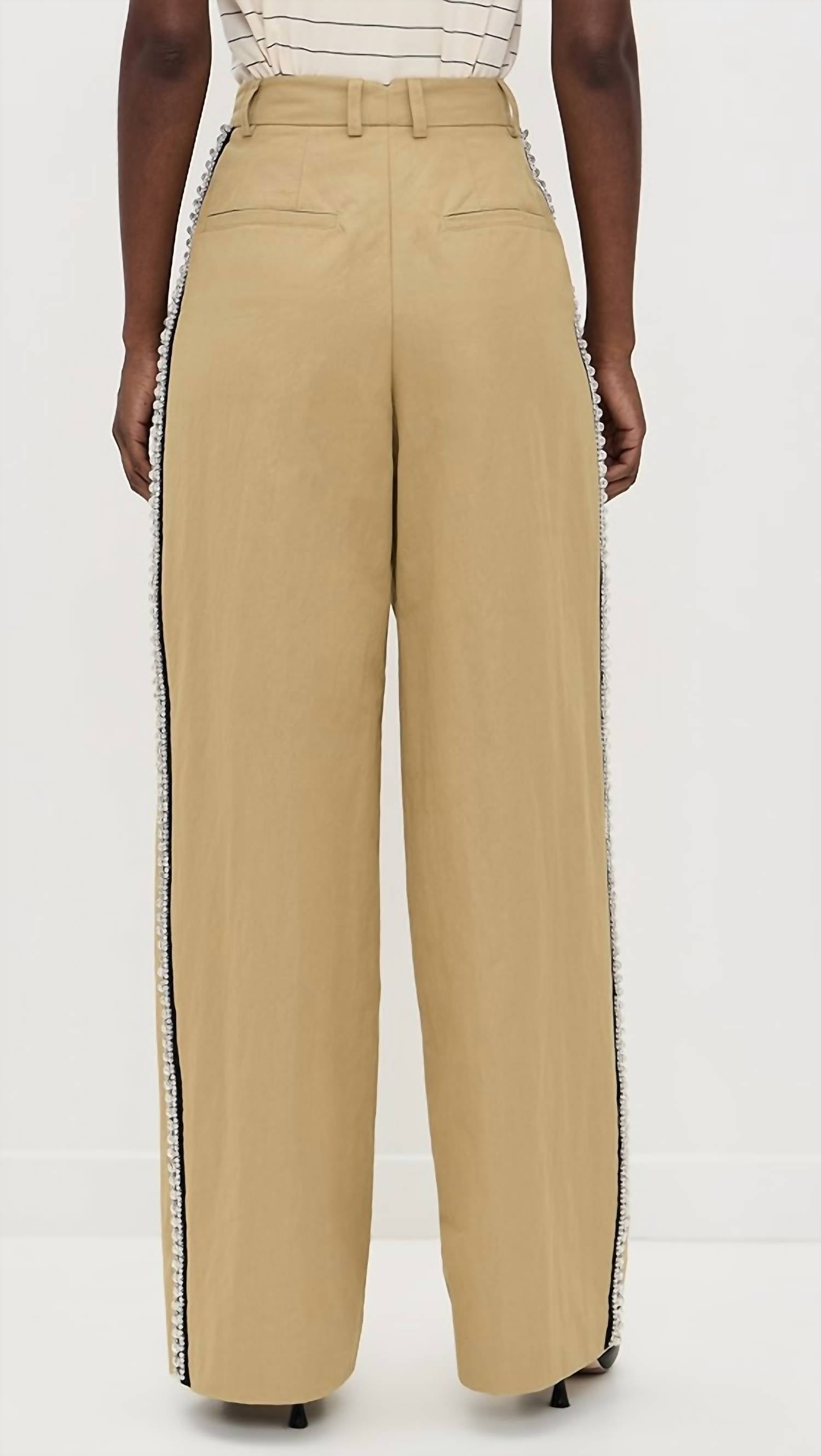 Introducing the Rhinestone Tape Pants by ESSENTIAL ANTWERP, designed for women in an elegant shade of Sad Beige. These wide-leg trousers offer a high-rise, comfort fit with a tailored look thanks to front pleats. Crafted from polyamide, they are embellished with a crystal stripe on each side, adding a glamorous touch. Closure: Button closure. Care: Hand wash. Suitable for evening events or workwear, these trousers are perfect for pairing with a crisp shirt for a sophisticated style.