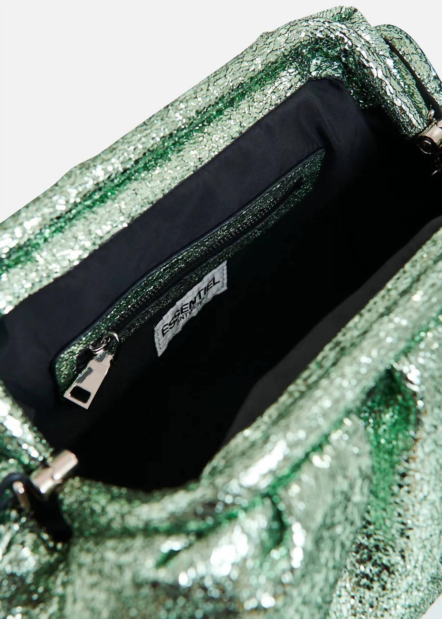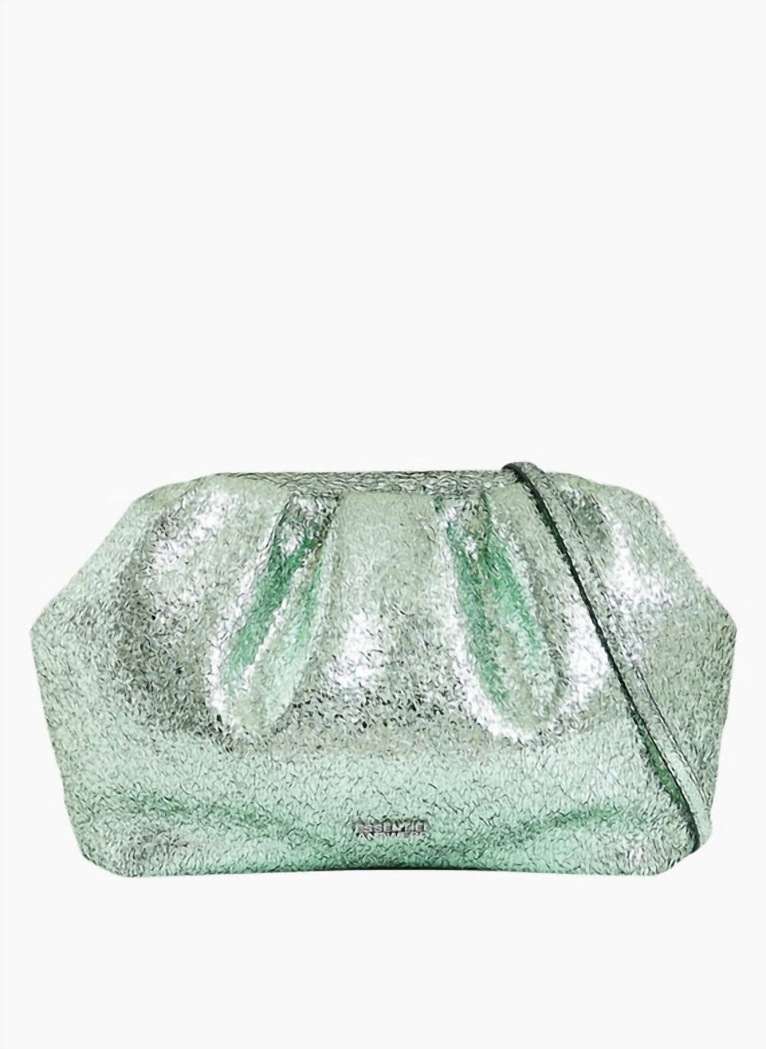 Introducing the Women's Hamaretto Pouch Bag by ESSENTIAL ANTWERP, a stylish and versatile accessory in Neptune Green. This faux-leather pouch is crafted from 100% polyurethane and features pleats that enhance its puffy silhouette. It secures your essentials with a magnetic fastening and offers the option of a detachable shoulder strap, offering flexibility to carry it as a clutch or shoulder bag. Inside, it boasts a lined interior with an internal zipped pocket, complemented by silver-tone hardware for a chic finish. Product dimensions: 11" x 8" x 3" x 9". Country of Origin: China.