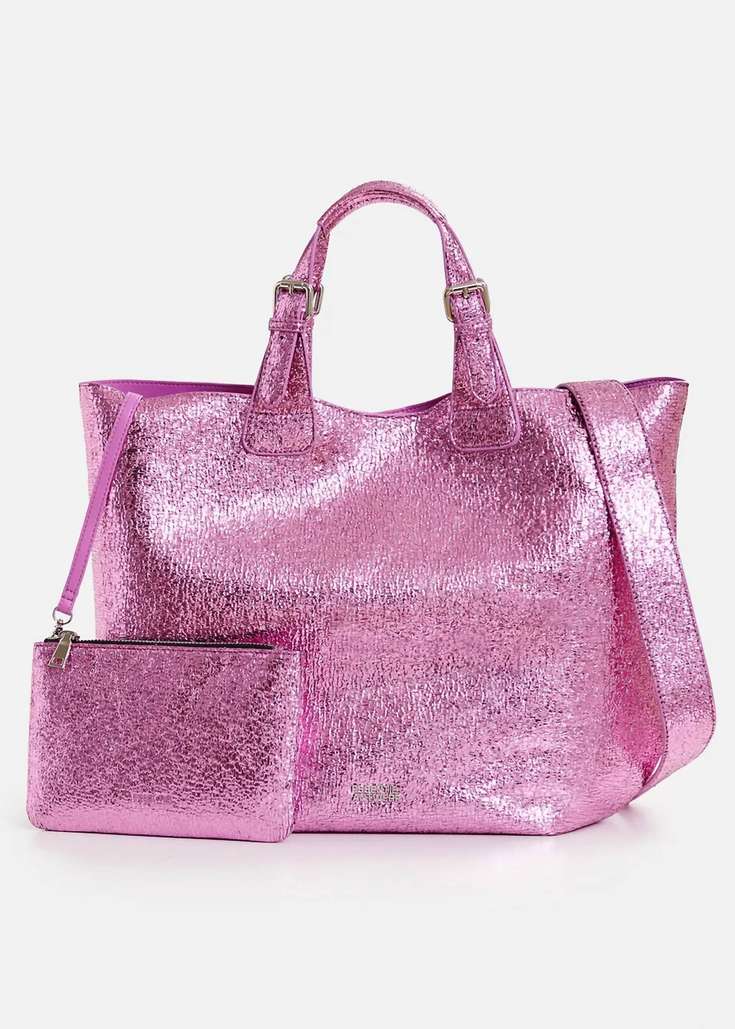 Aside from being the cutest bag ever, this tote is the perfect size to hold all of your vacation necessities. Pair this adorable bag with a flowing dress and some slides and you're all set! Meet the Women's Hurry Shopper Bag by ESSENTIAL ANTWERP, a chic accessory in Virtual Pink designed with a lustrous crinkle-effect faux leather. This tote offers a spacious interior and includes a removable zipped pouch for your smaller essentials. Featuring buckle-detailed top handles and a detachable shoulder strap, it provides versatile carrying options. Material: 100% Polyurethane; Hardware: 100% Zinc Alloy. Bag dimensions: 14" x 22" x 11", Shoulder strap drop: 14", Handle drop: 8".