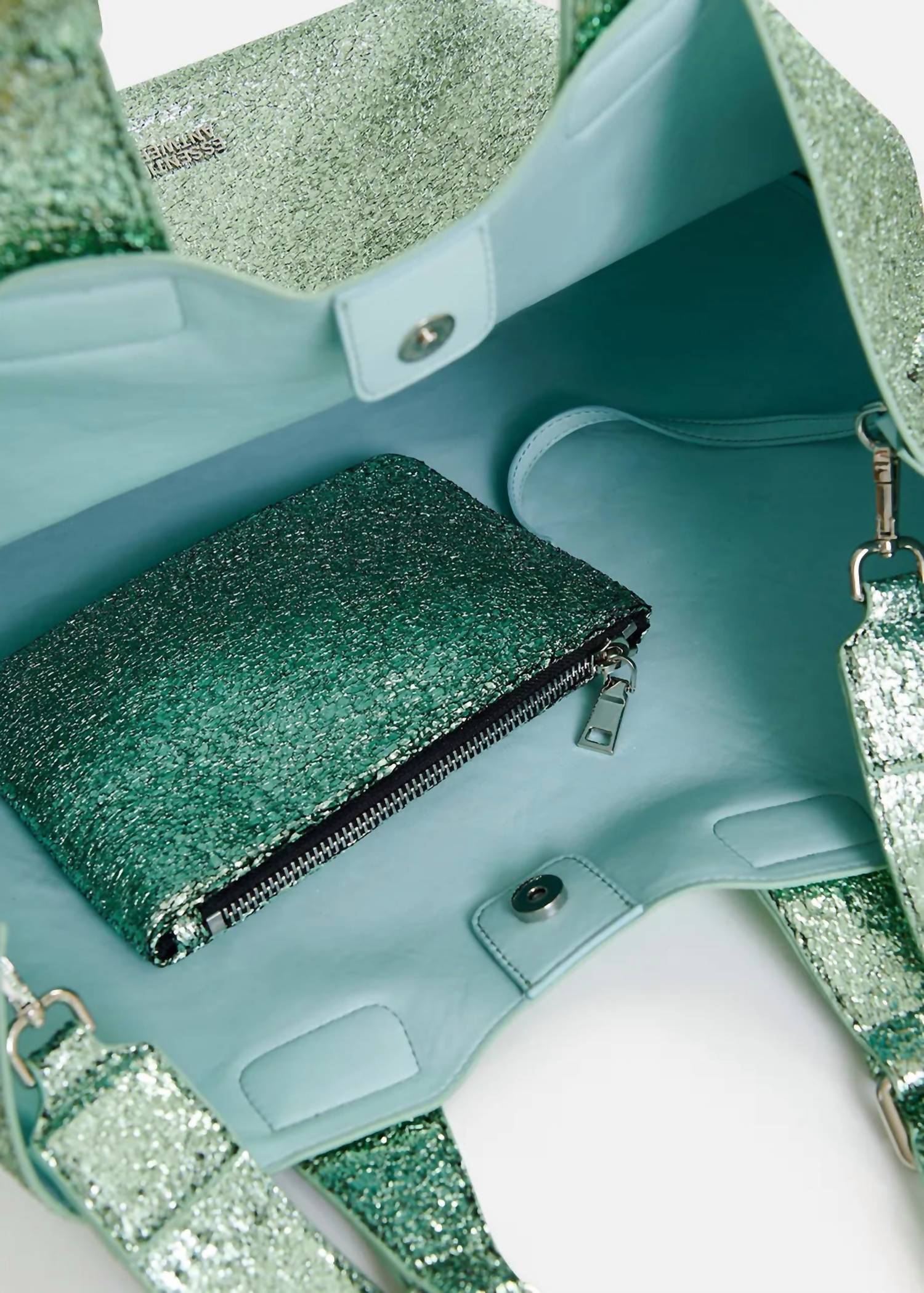 The perfect throw-it-in-and-go bag for your next weekend away or beach vacation! Its classic design will never go out of style and you'll be reaching for this bag season after season. Discover the Women's Hurry Shopper Bag by ESSENTIAL ANTWERP in a striking Neptune Green, perfect for everyday use. Crafted from 100% polyurethane with a lustrous crinkle-effect, it features a spacious, lined interior and a removable zipped pouch for organizing smaller essentials. This tote can be carried using the top handles with buckle detailing or a detachable shoulder strap, offering versatility. Bag dimensions: 14" x 22" x 11", with a shoulder strap drop of 14" and a handle drop of 8".