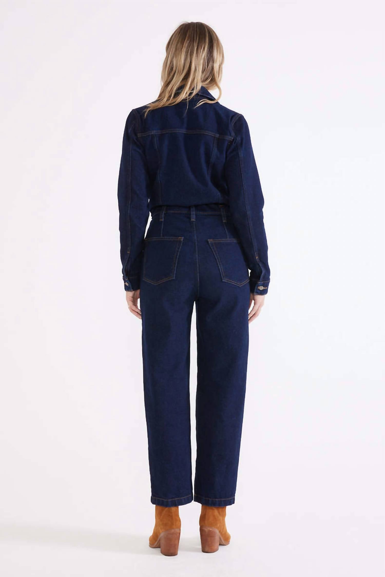 Throw it on and go! Step into a nostalgic vibe with the Farrah Zipper Front Denim Jumpsuit by ETICA, offering a chic 70's inspired design. This jumpsuit features long sleeves and a comfortable, straight-leg cut that is slightly cropped with a 27" inseam. Made from 100% cotton, it boasts a solid Night Swim shade. Closure is a convenient zip front, while the care instructions recommend machine washing and line drying, making this an effortless addition to your wardrobe.