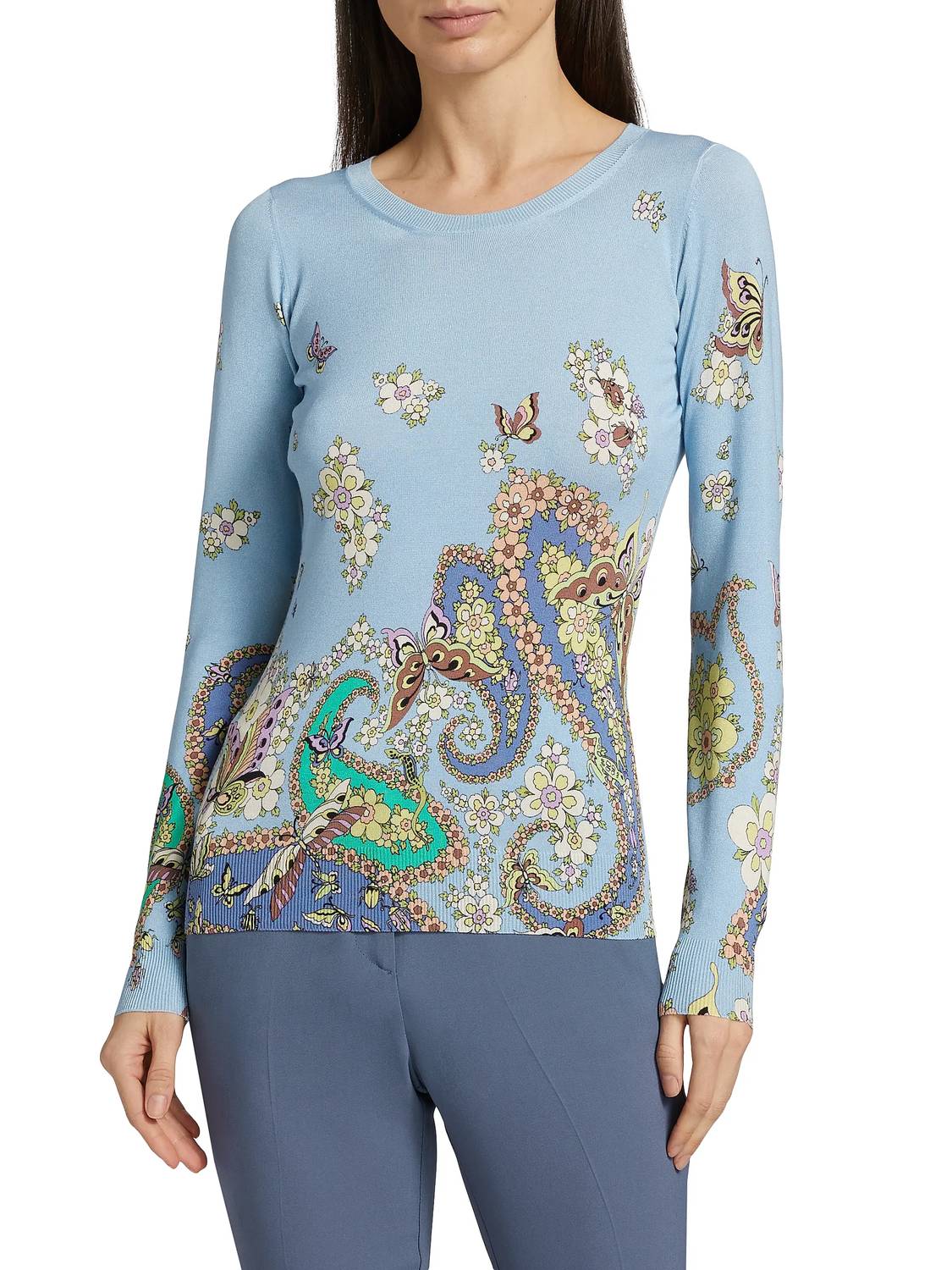 Stay warm and stylish in this versatile and effortlessly cool knitwear staple. Wear it alone or layered, it's the perfect sweater for the season and you'll wish you had it in every color. Introducing the Lucky Charm Long-sleeve T-shirt by ETRO, a delightful piece for women that combines style and comfort. Crafted in Italy from a luxurious silk blend (85% Silk 9% Polyamide 6% Elastane), this blue multi T-shirt features a whimsical paisley print, perfect for adding a playful touch to any outfit. The design includes a classic crew neck and effortless pull-on closure. For best care, dry clean only.