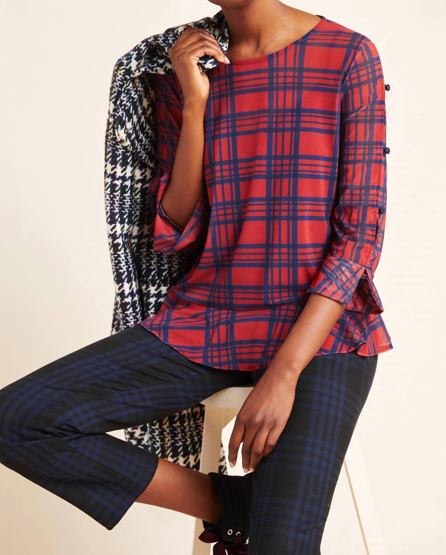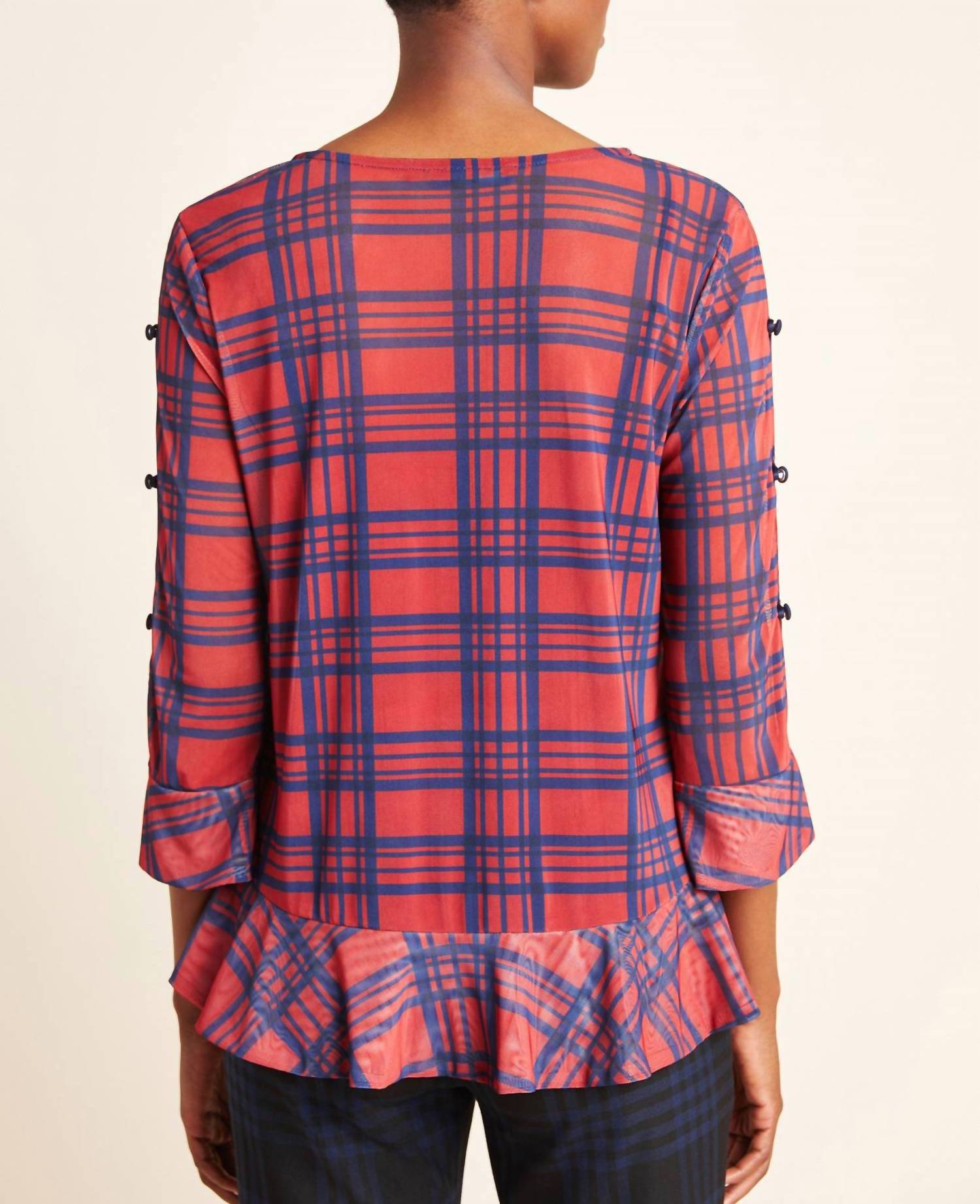 Great fit, cute design, soft fabric. You'll love everything about this long sleeve tee. Elevate your fall wardrobe in the vibrant Rachel Island Plaid. Features a stylish boatneck and three-quarter sleeves, complete with side slit detail and matching buttons for added flair. Boasts a flounced hem. Made from 100% polyester. Offering a lightweight, barely-there feel. Closure is effortless with pull-on styling.