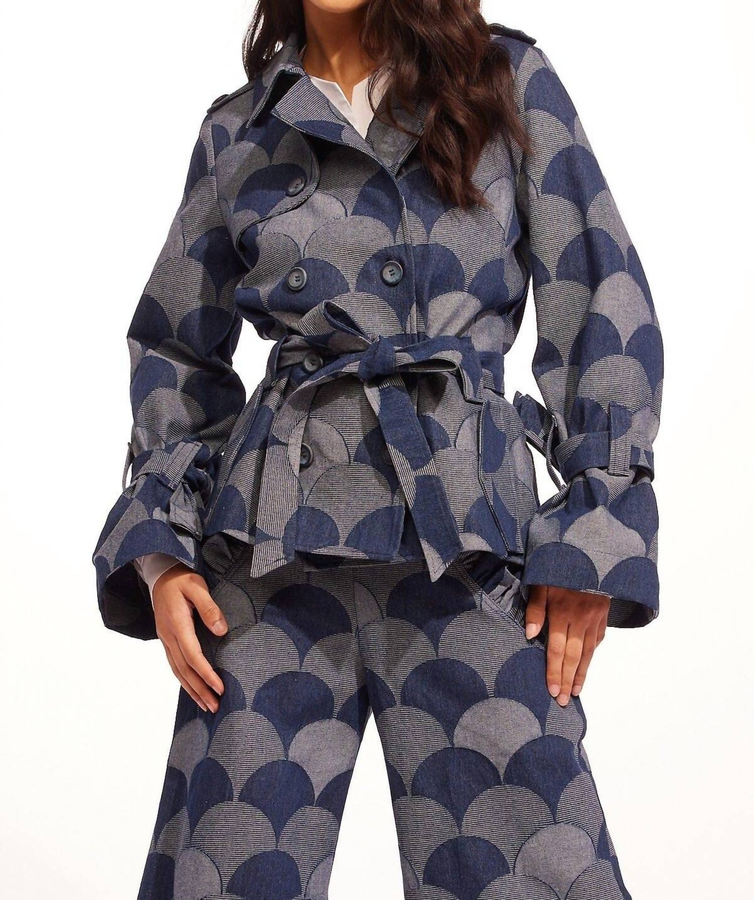 This stylish denim jacket ties at the waist for a flattering and comfortable fit with double breasted design.