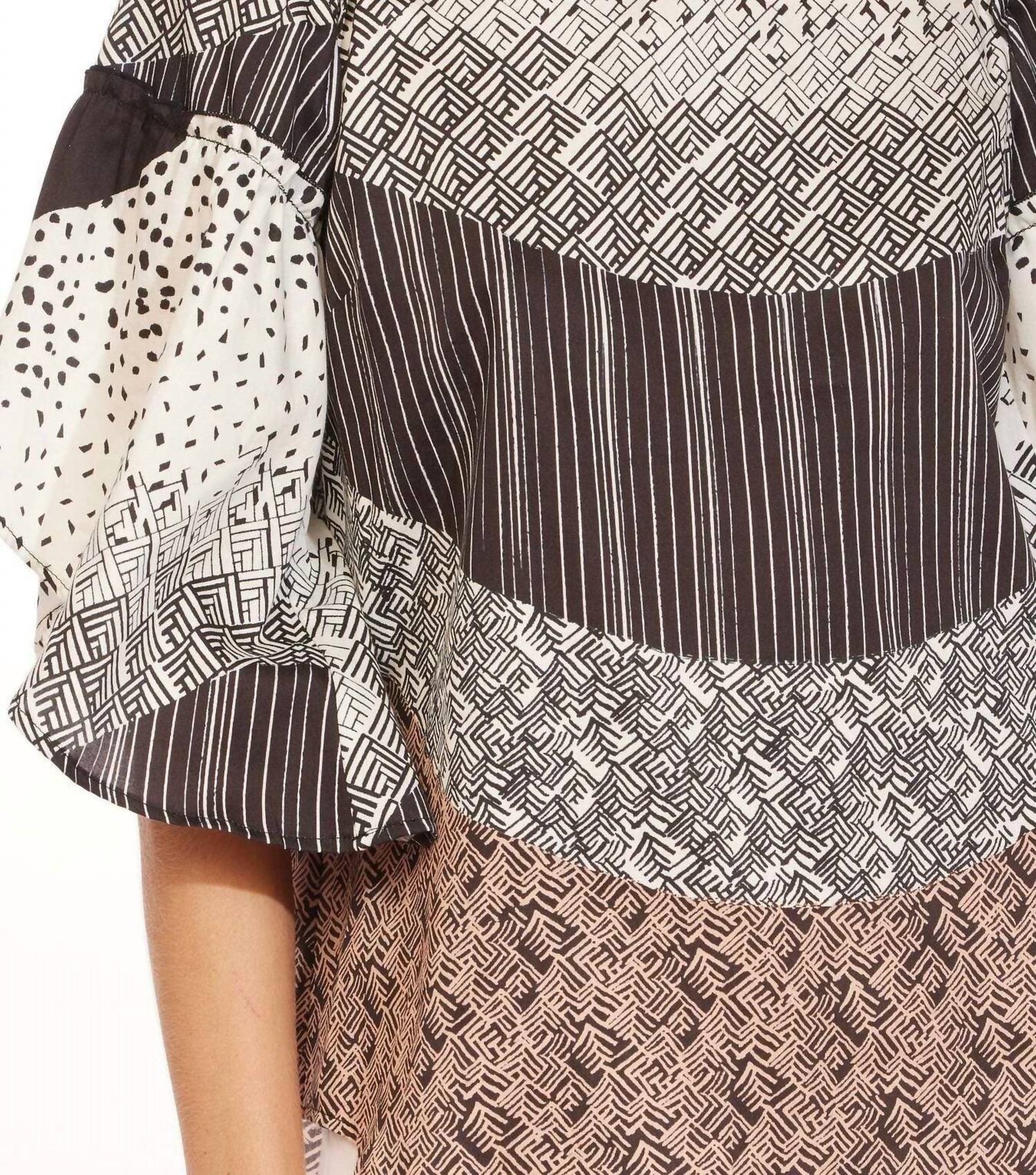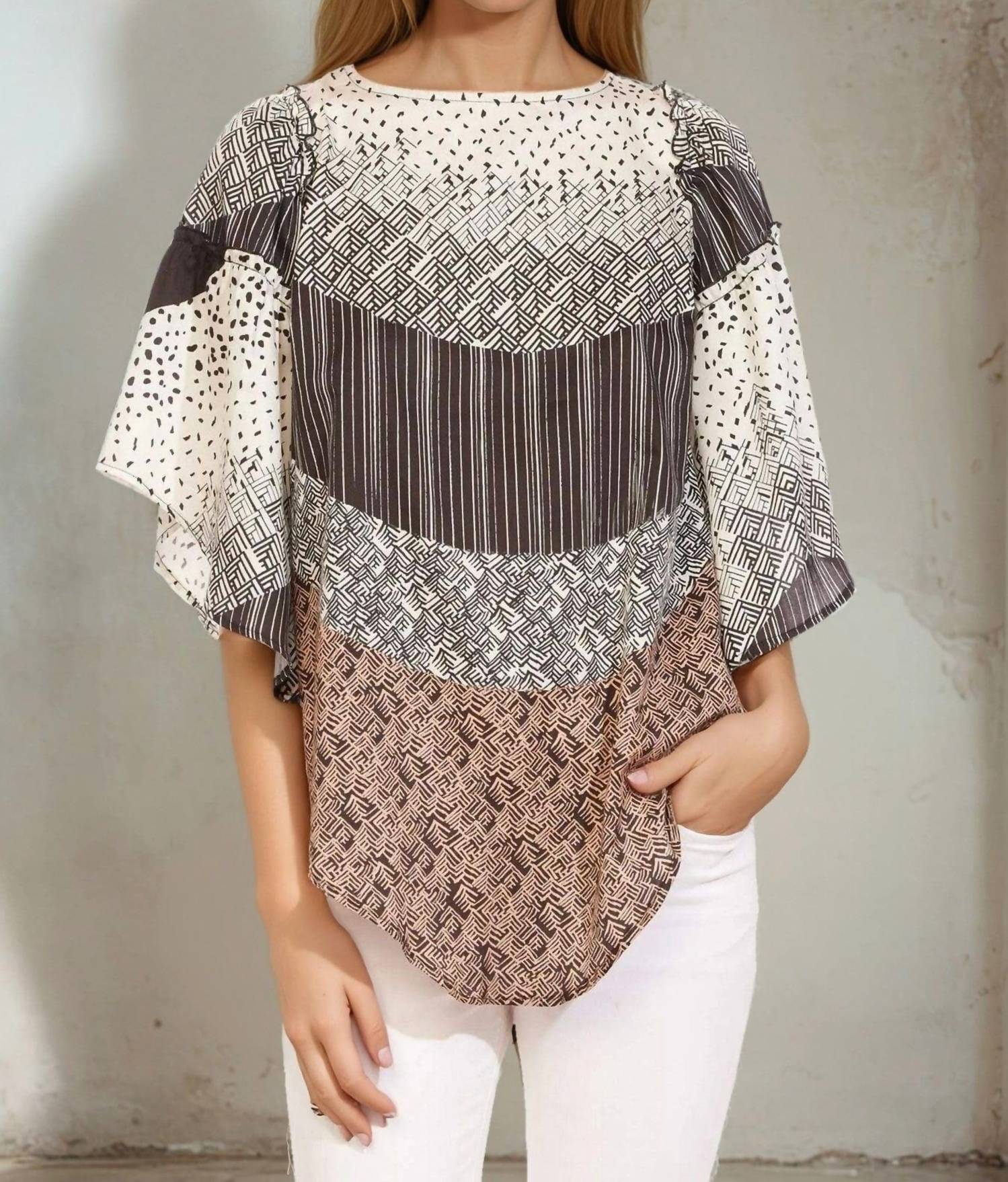 Upgrade your style with the Chiara Top by EVA FRANCO in Desert Coast, a Cotton poplin piece offering a unique take on Boho Chic. This blouse features three-quarter sleeves and a tie-back closure, perfectly complemented by an asymmetrical hem and ruffle details for added flair. It is made from 100% Cotton, providing lightweight and comfortable wear. Ideal for a Thanksgiving holiday party, the Chiara Top pairs effortlessly with any outfit this spring season.