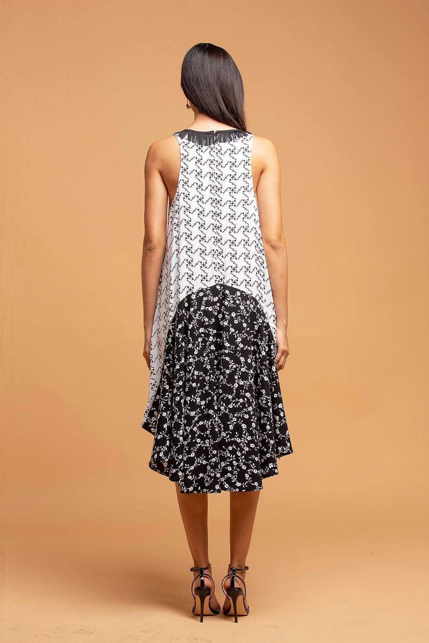 A short and breezy dress for those warmer days. Introducing the Claire Mini Dress by EVA FRANCO, an embodiment of boho chic perfect for any holiday party or event. This sleeveless dress, featuring a scoop neck with playful fringe detail, showcases a fit-and-flare silhouette with a striking floral pattern in black and white. Made from 100% Polyester, it boasts a fully lined interior and a stylish high-low hem, measuring approximately 41 inches long. This piece is crafted with care in the USA and features a convenient zip closure. To maintain its pristine condition, dry cleaning is recommended.