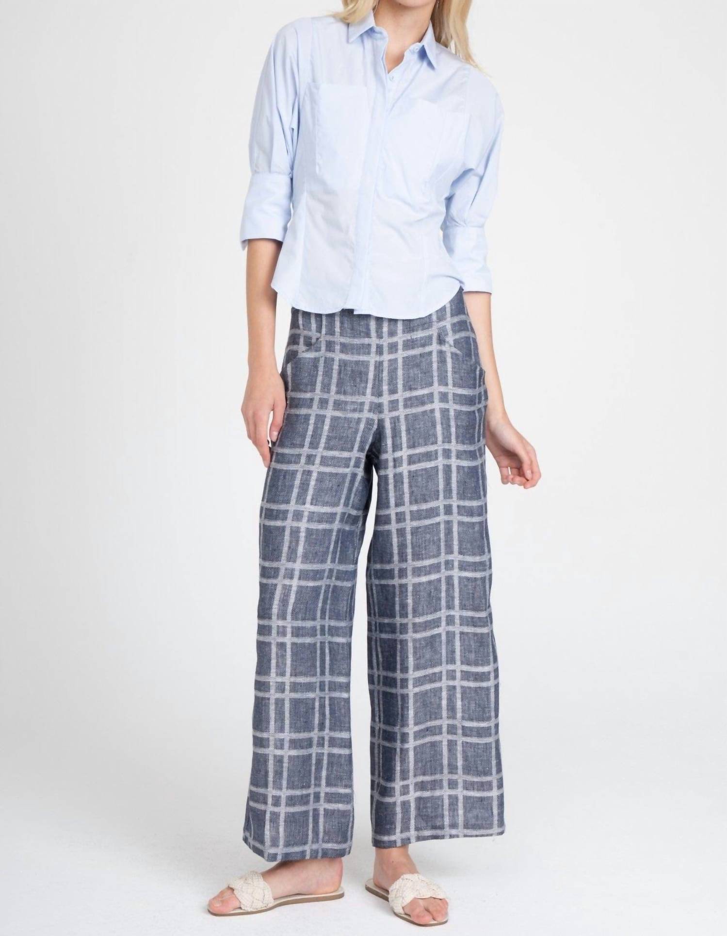 Introducing the Hepburn Linen Pants by EVA FRANCO, crafted in an indigo plaid to elevate your style game. These women's wide-leg pants are made from lightweight linen, featuring a low-rise and high waist for a comfort fit, complete with side pockets for added convenience. The side zipper closure ensures a sleek silhouette, making them perfect for a vintage-inspired look at your next holiday party. Ideal for spring, don't miss out on adding this versatile piece to your wardrobe.