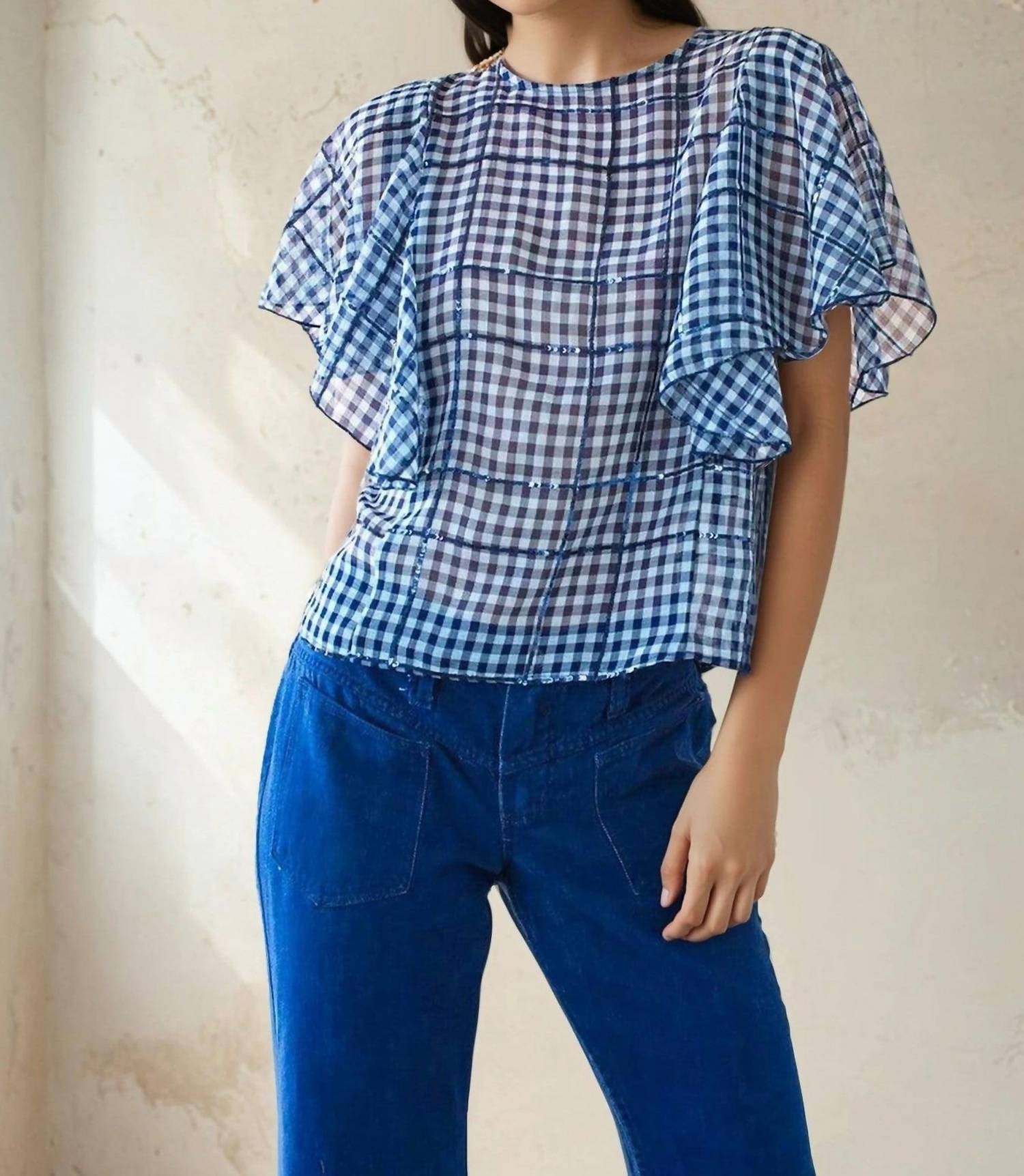A timeless blouse that will never go out of style. Elevate your look with the Juniper Cape Sleeve Top by EVA FRANCO, featuring short cape sleeves for airy sophistication. This blouse is crafted from Indigo Gingham polyester with eye-catching navy sequins, complete with a coordinating spaghetti strap cami. Made in the USA, it boasts a classic crewneck and a discreet button closure. Care is easy with dry cleaning recommended for this elegant piece, perfect for holiday parties or spring events.