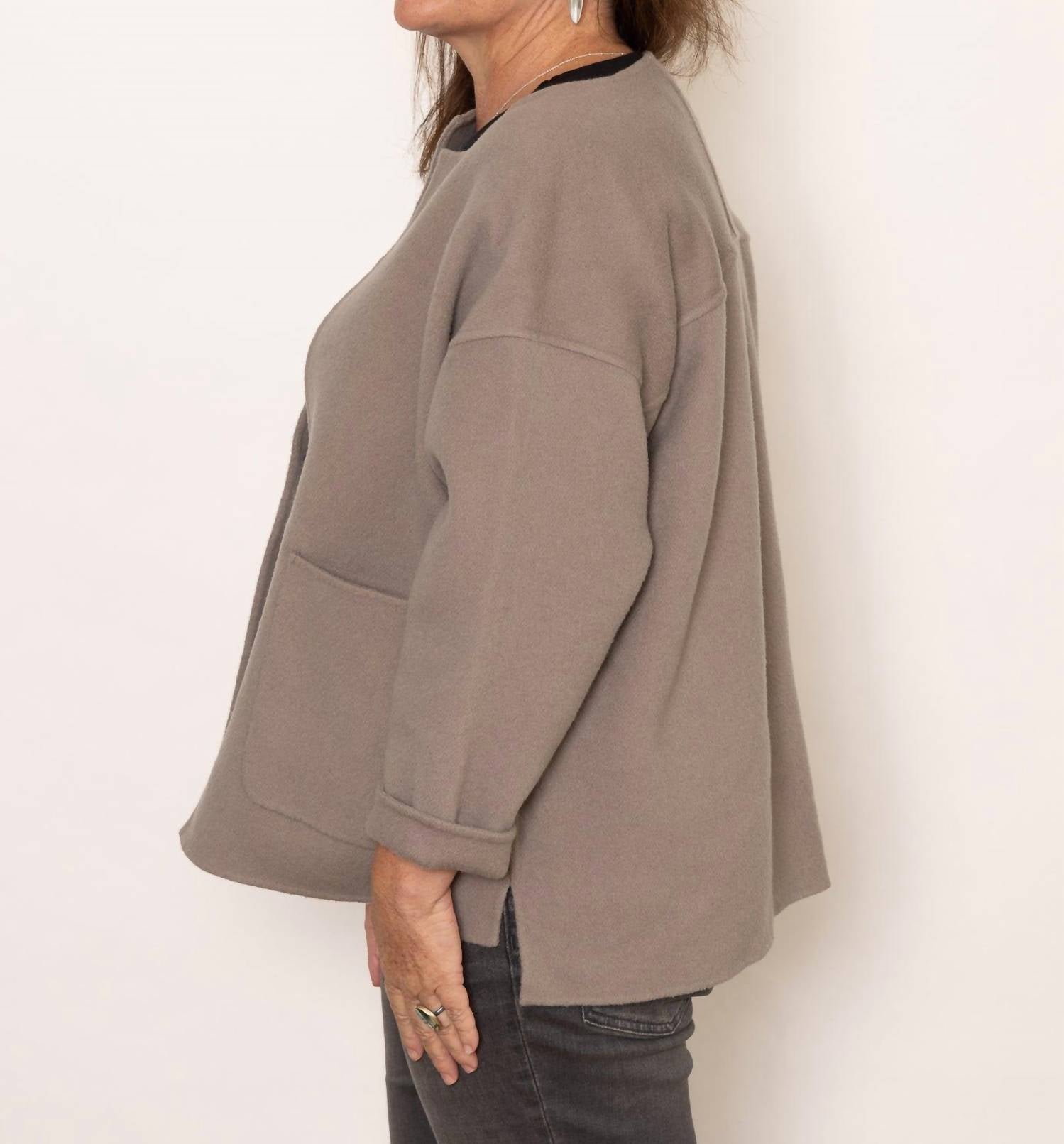 This utility jacket is the perfect combination of cool and feminine. Experience understated elegance with the Evam Eva 3/4 Sleeve Short Coat in a rich mocha hue. Crafted from Japan for women, this coat features three-quarter sleeves and a crewneck neckline, embodying a minimalist aesthetic. The solid pattern and drop shoulders give it a contemporary look, while side slit pockets add practicality. Closure: Hook and Eye. Perfect for travel and Thanksgiving gatherings, it fits seamlessly into your fall wardrobe.