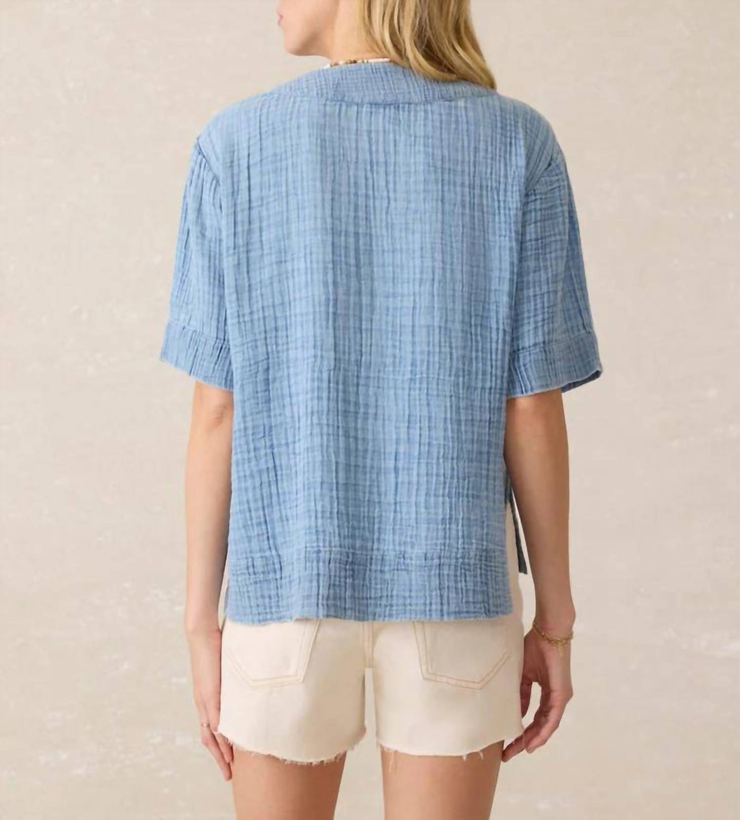 The short sleeve tee you'll want in every color. Embrace effortless elegance with the Dune Cotton Gauze Short Sleeve Top by Faherty, designed in a chic Light Indigo Wash. This breathable top features short sleeves and is crafted from 100% organic cotton, providing lightweight comfort perfect for warmer weather. The relaxed fit and thoughtful details like the overlap at the front neckline and side seam slit enhance its versatility. Closure: Pull-on. Care instructions include turning the item inside out and machine washing it cold with like colors on a gentle cycle, followed by a low tumble dry setting.