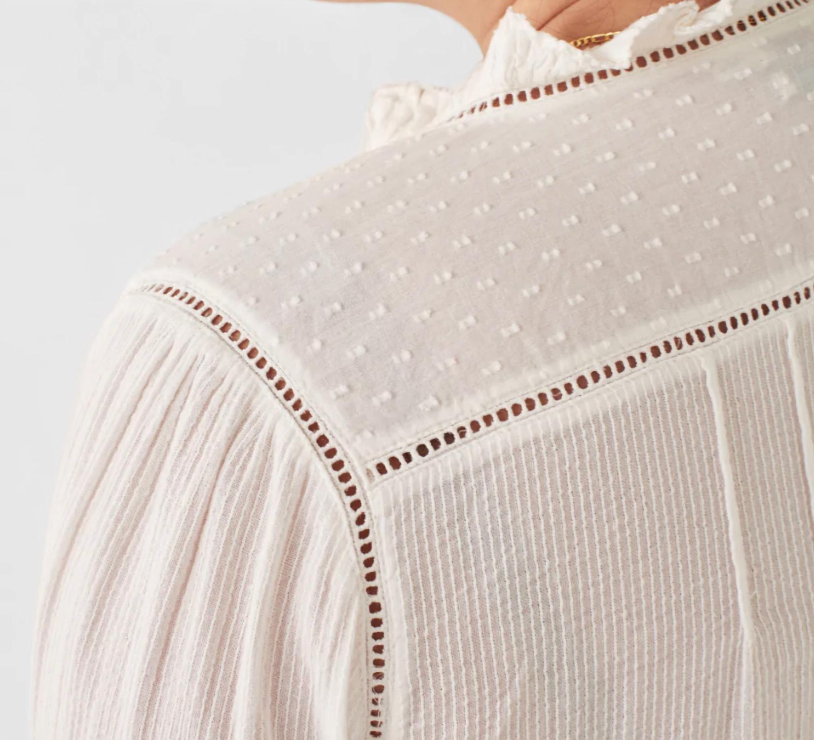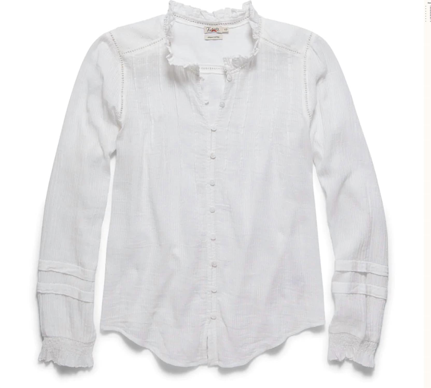 A versatile blouse that works from desk to dinner! The Willa Top by Faherty is a timeless addition to any wardrobe, crafted in a textured, 100% Organic Cotton that offers both comfort and style. Sporting long sleeves with elasticized ruffle cuffs, this blouse features a ruffled stand collar and a button closure for a touch of elegance. Imported, this boho-chic piece is perfect for spring occasions, offering embroidered detailing, blouson sleeves, and a romantic vibe. Care is simple with machine wash cold and tumble dry low instructions, ensuring ease of maintenance.