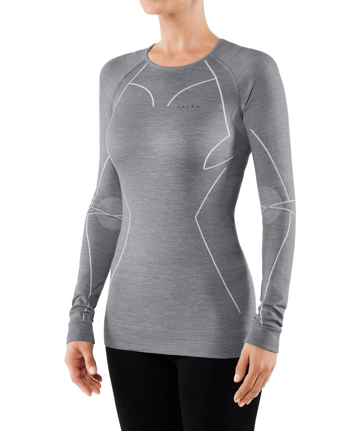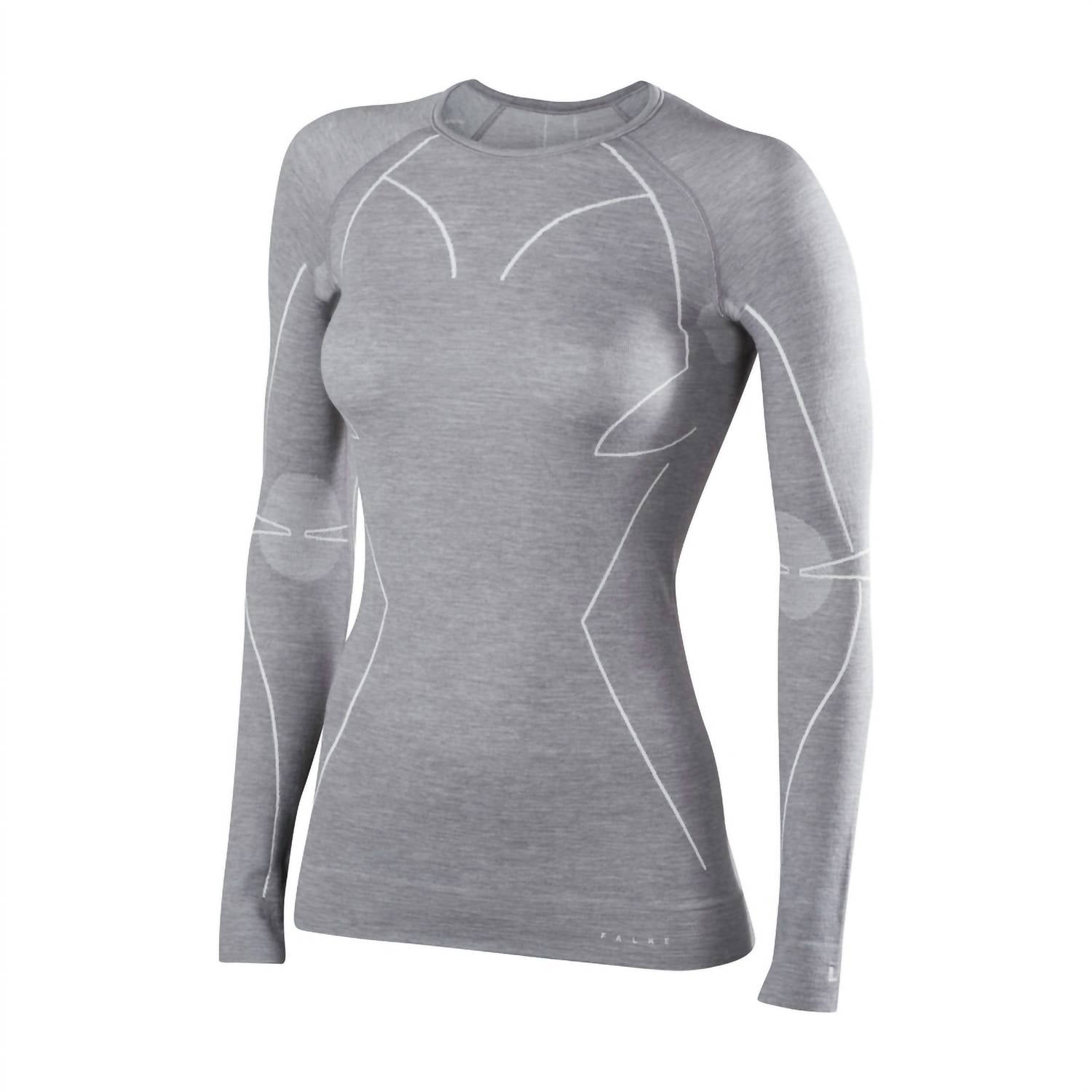 Introducing the Wool-tech Long Sleeve Baselayer Top by Falke, an essential for any skiing day. This women's base layer in Grey Heather is crafted from a blend of 55% Merino, 43% synthetic fibre, and 2% elastane, providing warmth and comfort without bulk. Designed with a crewneck and pull-on closure, it boasts superior moisture wicking and thermal management. For care, machine wash at 30°C and lay flat to dry.