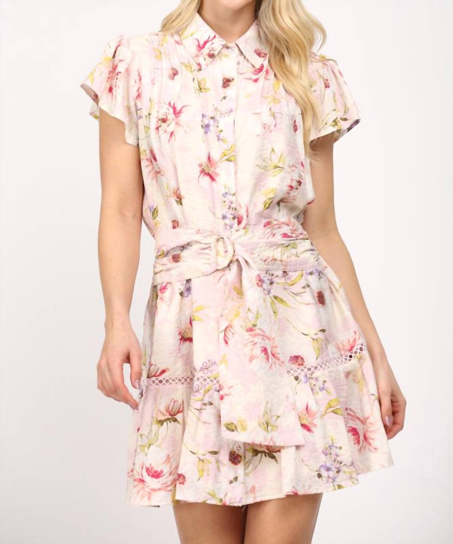 A short and breezy dress for those warmer days. Introducing the Floral Belted Mini Dress by Fate, a chic and feminine piece perfect for your summer wardrobe. This shirt-silhouette dress features cap sleeves and a collared neckline in a delightful pink multi-floral pattern. Composed of a lightweight, breathable fabric blend with the upper part being 83% rayon and 17% nylon, and the lower part 100% rayon, it ensures comfort without compromising style. Closure type: Button closure. Care: For best results, hand wash or machine wash on a gentle cycle and lay flat to dry. Ideal for vacation and day outings, it combines a relaxed fit with elegant lace accents.