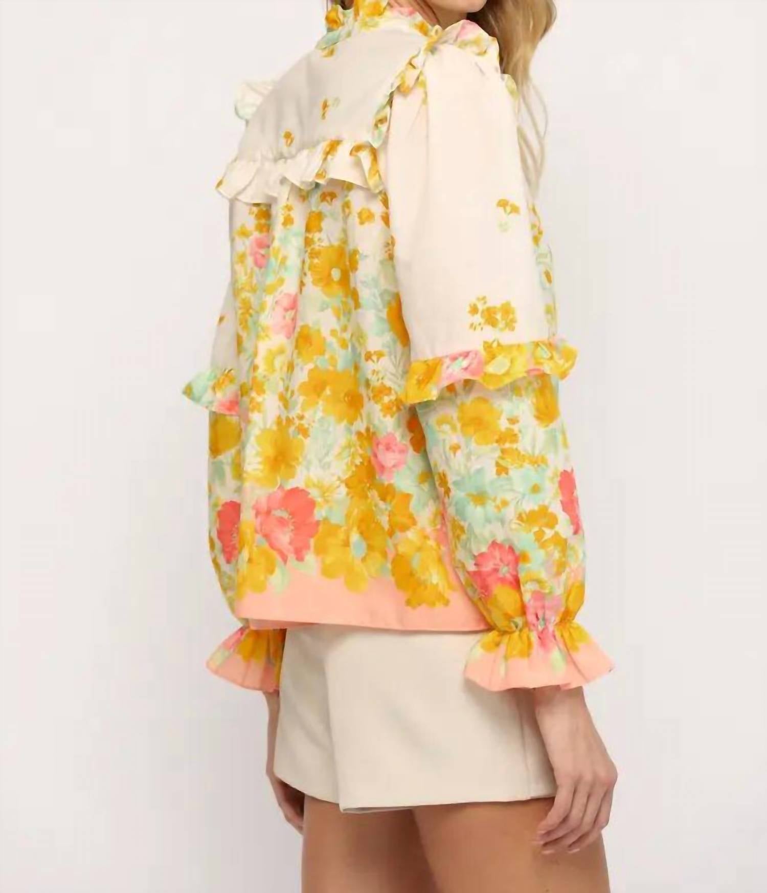 Pair this with your favorite jeans and slides for your next girls night out. Embrace effortless elegance with the Floral Whimsy Ruffle Blouse by Fate, a captivating piece in a vibrant yellow ombre floral print. Featuring long sleeves and a stylish V-neck, this blouse pairs boho chic charm with modern sophistication. Composition: Shell is 100% Polyester, and the lining is 100% Cotton. Closure: Pull-on. Perfect for a summer housewarming event, this blouse exudes a whimsical appeal that effortlessly elevates any wardrobe.