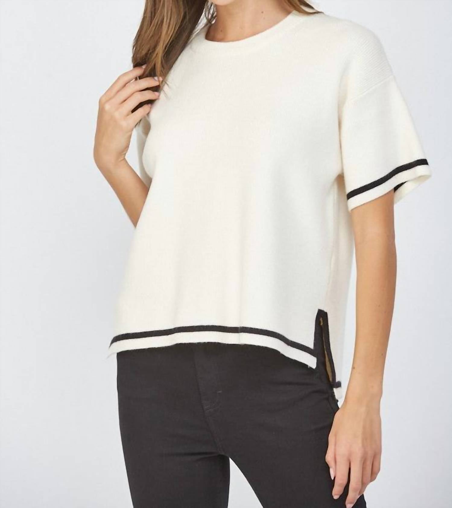 A timeless blouse that will never go out of style. Discover the Tipped Side Slit Boxy Sweater by Fate, an elegant choice for those who favor minimalist style. This short sleeve sweater is crafted from a viscose blend, specifically 55% viscose and 45% nylon, in a chic French Vanilla hue. Designed with a relaxed boxy silhouette and crewneck, it features a pull-on closure for easy wear. Care: Hand wash. Model height: 5'9.5".