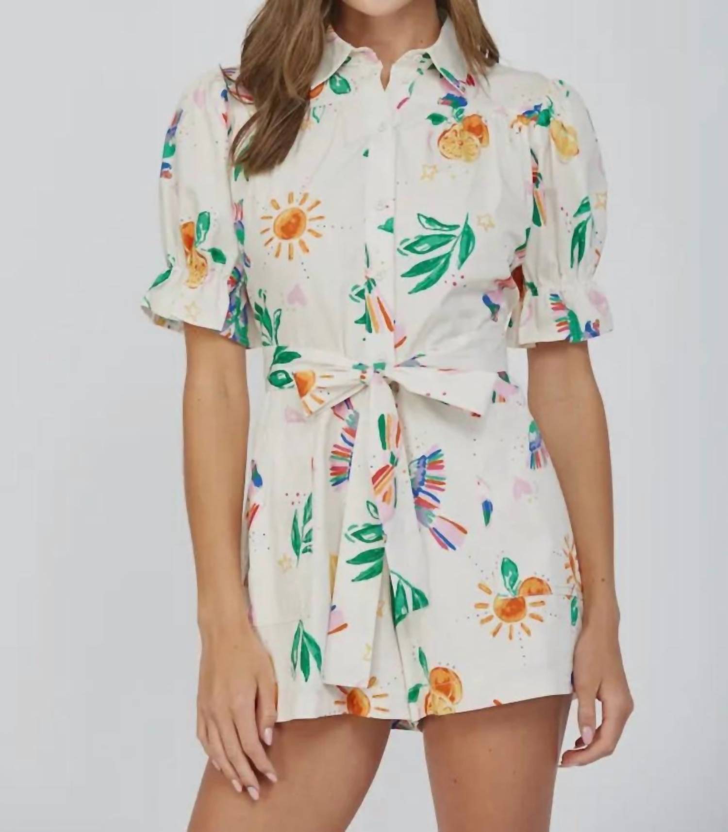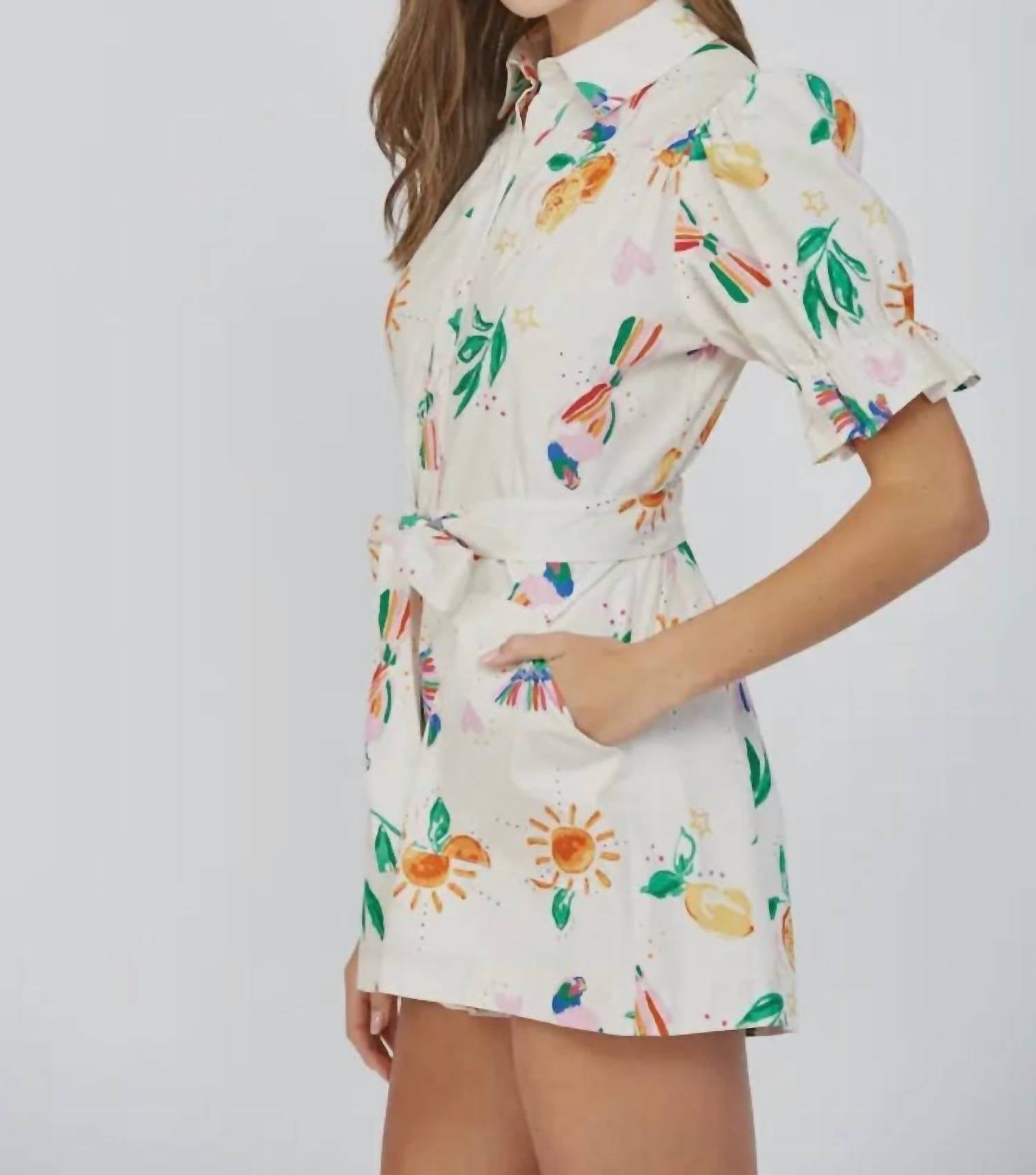 It doesn't take much for this one piece to look effortlessly cool. Add some statement jewelry to dress it up, or throw on some sneakers for a more casual vibe. Introducing the Sunny Zest Romper by Fate, a vibrant cream multi-piece that effortlessly captures summer vibes. Featuring short sleeves, this romper is crafted from 100% cotton for ultimate comfort and style throughout the day. With a playful citrus graphic print, it includes convenient pockets and a button closure for a chic touch. Perfect for a beach day or brunch outing, this romper is your go-to choice for adding fun flair to your seasonal wardrobe.