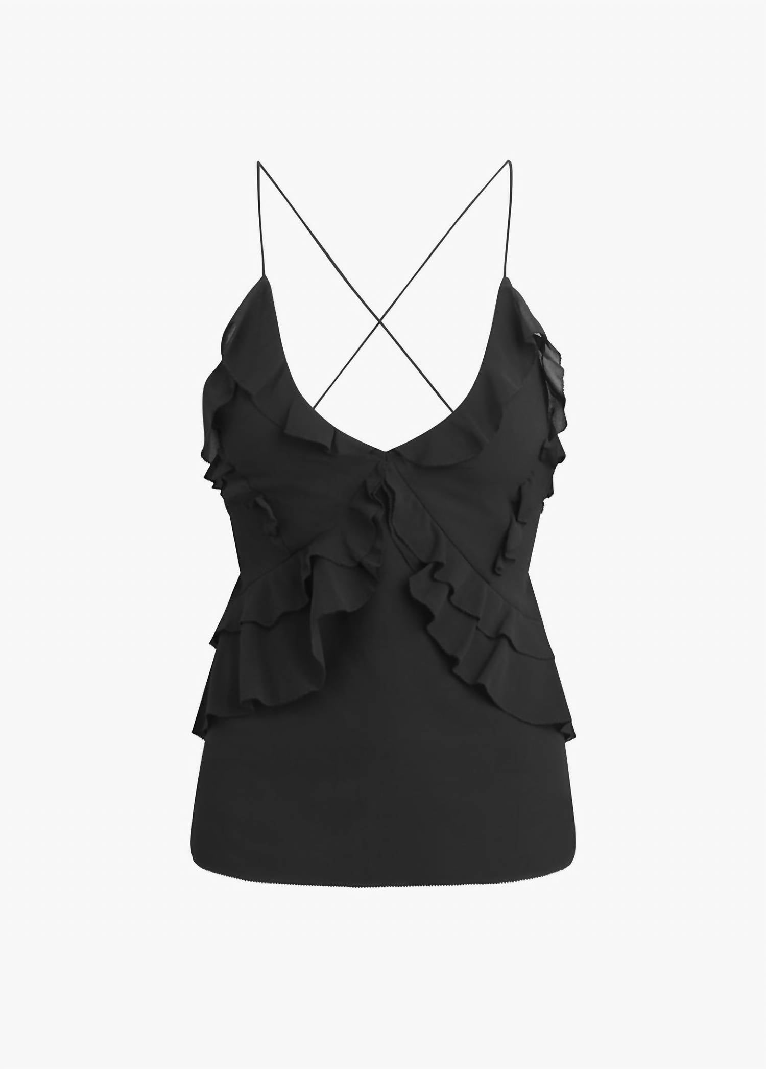 Introducing the Who Me? Top by Favorite Daughter, a chic addition to your spring wardrobe. This black tank top boasts spaghetti straps that crisscross at the back and features elegant picot-edge ruffles on the front. Made from 100% polyester, this solid-colored top falls to a high-hip length, perfect for pairing with both denim and more formal pieces. Easy to wear with a pull-on closure, it's also machine washable for hassle-free care.