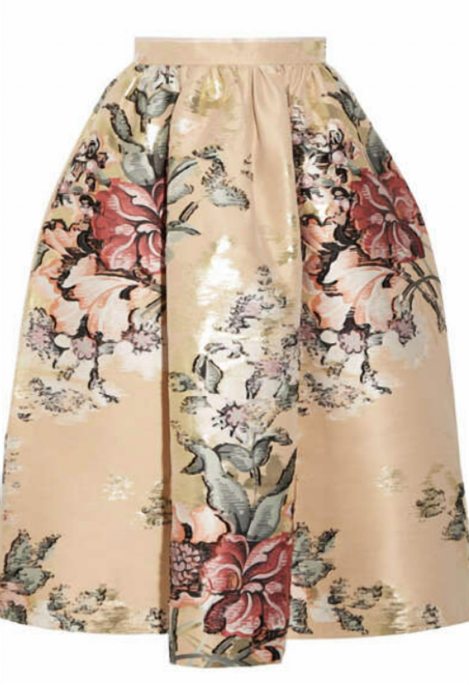 Show off just the right amount of skin in this beautifuly designed midi length skirt. Embrace the spirit with this Metallic Floral Jacquard Midi Skirt in Cream, inspired by the carefree aura of Marie Antoinette. Featuring intricate, colorful blooms, this polyester skirt showcases a front box pleat for added structure and volume. Country of Origin: Italy. Zip closure. Dry clean only. This piece is an elegant summer choice in size 46 (US 12/14) with functional pockets for convenience. 66% polyester, 28% cotton, 6% metallic fibres.