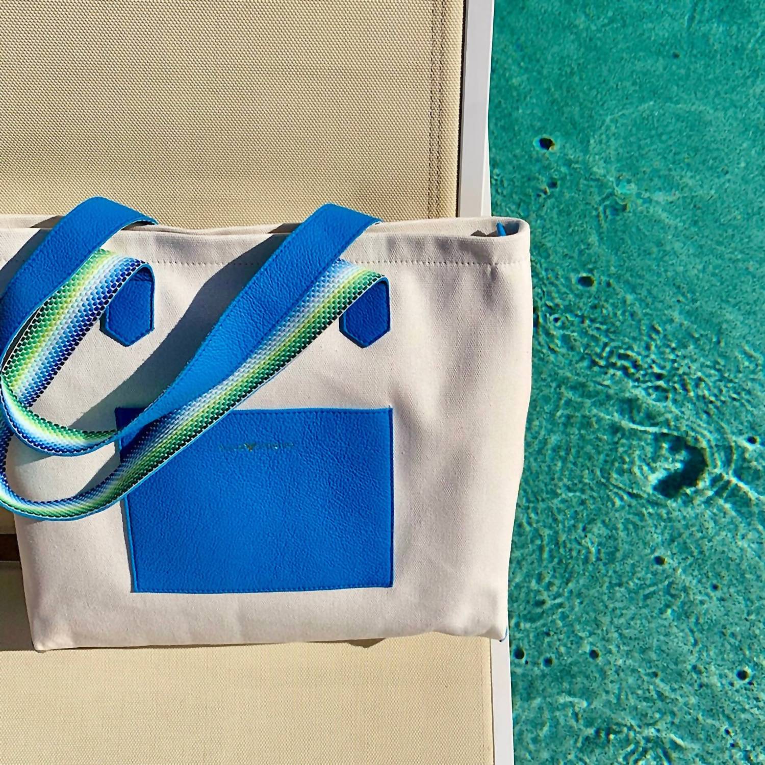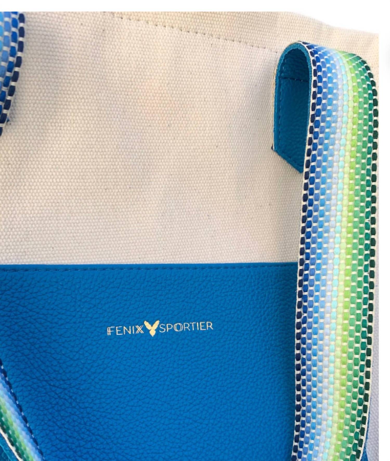 The carry-all tote bag of the season. Get in vacation mode with this perfectly sized tote bag that is the perfect accessory for beach days, pool parties, or sunset dinners. Introducing the Women's Aprés Pickle Bag by Fenix Sportier, a stylish tote designed to celebrate your love for the Pickleball Life. This bag is crafted from durable canvas and trimmed with bright blue Italian leather, featuring double-sided handles made from custom Italian woven webbing. Its spacious interior easily accommodates a tennis racket, pickleball paddles, or a rolled yoga mat. Dimensions are 18” wide by 17” tall, making it the perfect companion for on- or off-court activities. Closure: Gold zippered top closure.