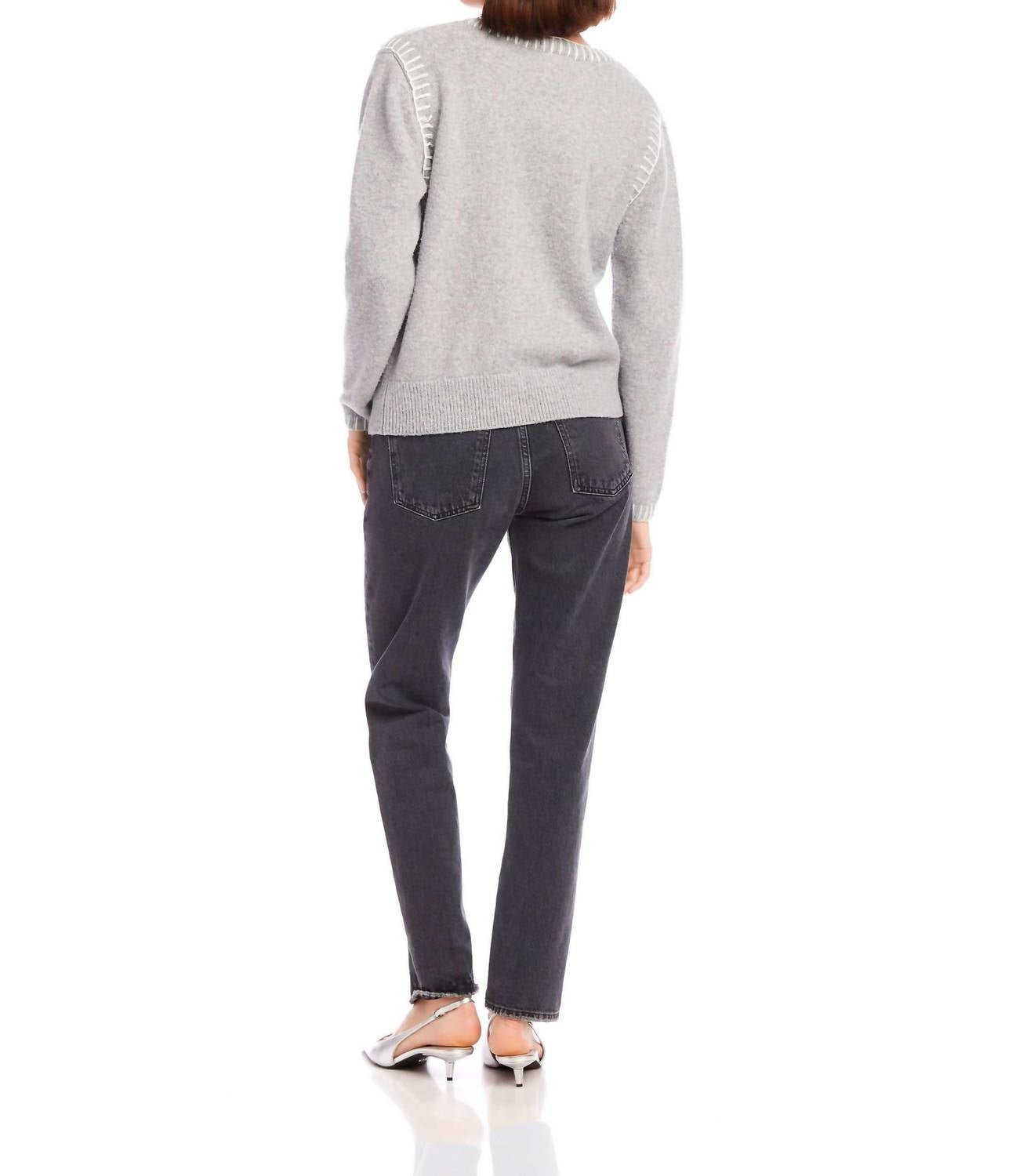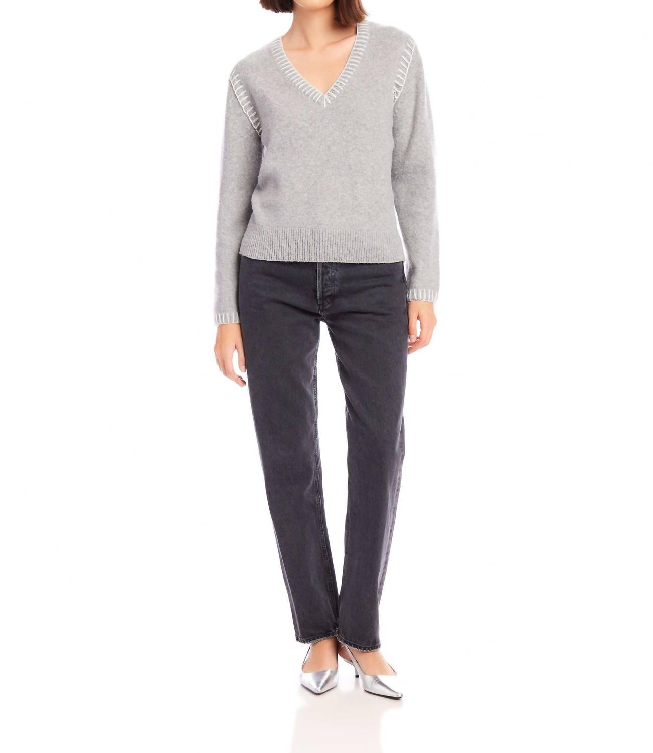 You'll be reaching for this comfy and classic v-neck sweater all season long. Introducing the Ali Stitch V-neck Sweater by Fifteen Twenty, a stylish gray addition perfect for fall evenings and New Year's Eve celebrations. This sweater features long sleeves with a ribbed hem and cuffs and is made of a soft blend of 52% recycled polyester, 30% nylon, 15% polyester, and 3% spandex, ensuring both comfort and sustainability. At a length of 23 1/4 inches, this solid-patterned sweater offers a unique touch with its white edge stitch detail. It is imported, with a pull-on closure, and requires dry cleaning for maintenance, ensuring it remains a key piece in your 90s fashion-inspired wardrobe.