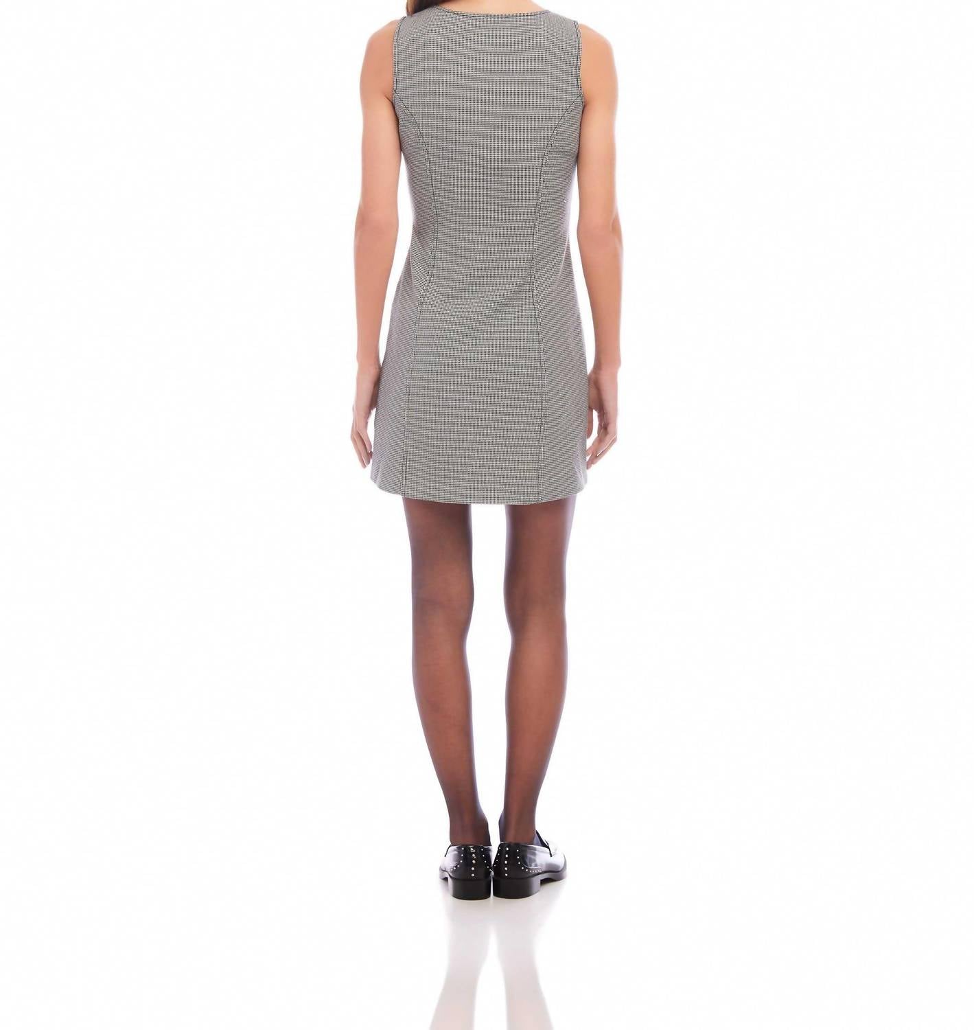 A short and breezy dress for those warmer days. Experience the elegance of the Avery Button Front Sleeveless Dress by Fifteen Twenty, a chic piece designed for modern sophistication. With a sleeveless design, this dress is crafted from a Mini Houndstooth pattern with a composition of 54% Viscose, 41% Cotton, and 5% Spandex, ensuring both stretch and comfort. Measuring 34 inches in length for size S, it features a scoop neck and side zip closure for easy wear. Proudly made in the USA from imported fabric, it requires dry cleaning only.