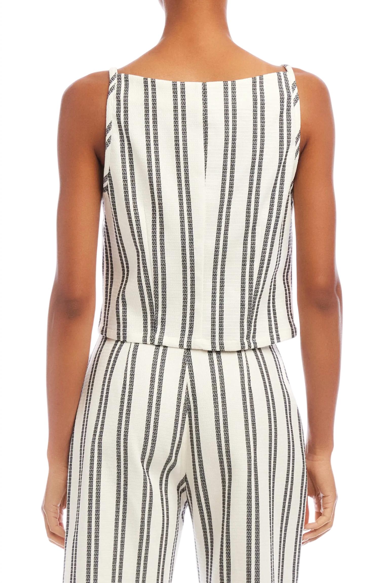 Introducing the Elis Cotton Button-up Top by Fifteen Twenty, a striped crop top perfect for minimalist summer styles. This sleeveless design features a chic square neckline and measures 15.5" in length for a flattering fit. Expertly crafted from a cotton blend of 98% cotton and 2% elastane, it offers comfort with a touch of stretch. Closure is achieved via a front button closure, and it's imported. For long-lasting wear, machine wash and line dry.