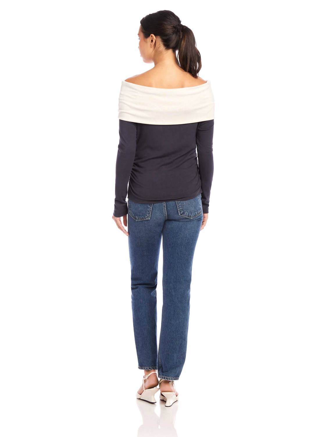 Great fit, cute design, soft fabric. You'll love everything about this long sleeve tee. Introducing the Jillian Off-The-Shoulder Top by Fifteen Twenty, a chic and versatile piece in a sleek granite color. This top features elegant long sleeves and a stylish twist neck detail, creating a sophisticated off-the-shoulder silhouette. Made from a soft ponte knit blend of 93% rayon and 7% spandex, and crafted in the USA from imported fabric, it measures 20 inches in length for size S. Designed with convenience and care in mind, it is a pull-on style best maintained with dry cleaning or hand washing cold and laying flat to dry.