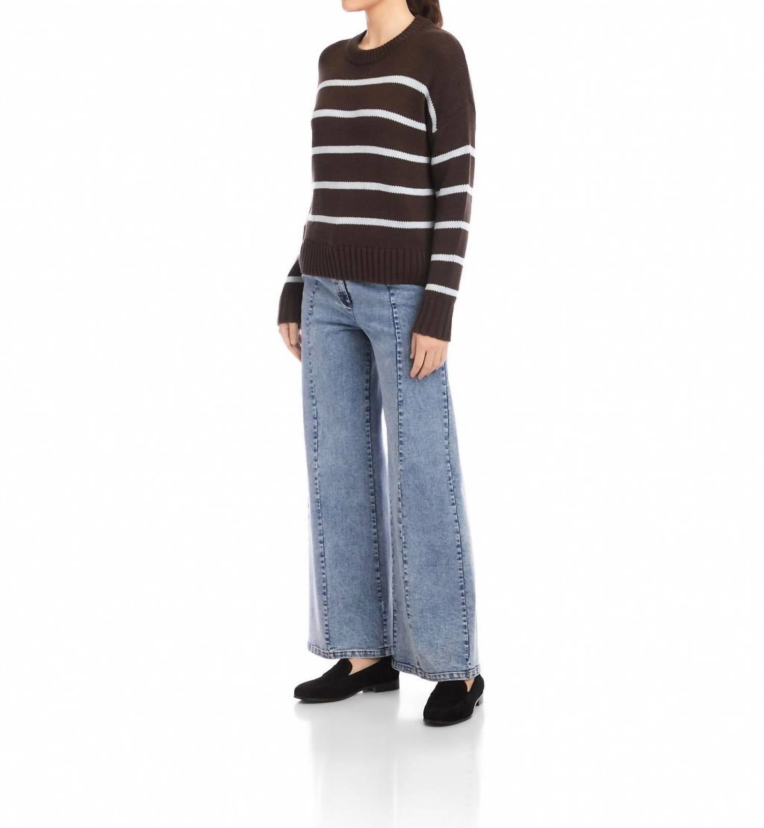 Experience the perfect blend of comfort and style with this trendy crew neck sweater, designed to effortlessly elevate your wardrobe. Pair it with your favorite denim and loafers for the perfect look. Experience the Luca Crewneck Sweater by Fifteen Twenty, crafted for those cozy yet fashionable days. This long-sleeve sweater features bold horizontal stripes in brown and light blue, complemented by a ribbed crew neckline and dropped shoulders. Made from 54% Acrylic, 44% Cotton, and 2% Spandex, it's knitted with a chunky texture that adds a minimalist charm. With a length of 19.5 inches for size S, this imported pullover is perfect for Thanksgiving gatherings and adheres to minimalist trends. Care instructions: Hand wash cold and lay flat to dry, or dry clean.