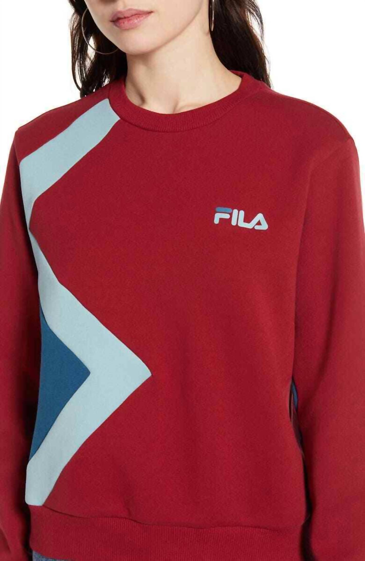 Cooler temps call for layering and we love this adorable sweatshirt for all the obvious reasons. Experience sporty chic with the Women's Kazuno Sweatshirt by FILA, showcasing a striking zigzag graphic that adds a modern twist to color blocking. With its long sleeves and crewneck design, this sweatshirt offers both comfort and style, crafted from a soft 61% cotton and 39% polyester blend. Its pull-on style makes it effortlessly easy to wear. Length is 22.5", shoulder width is 16", chest measures 20.25", and sleeve length is 25". For care, simply machine wash and tumble dry.