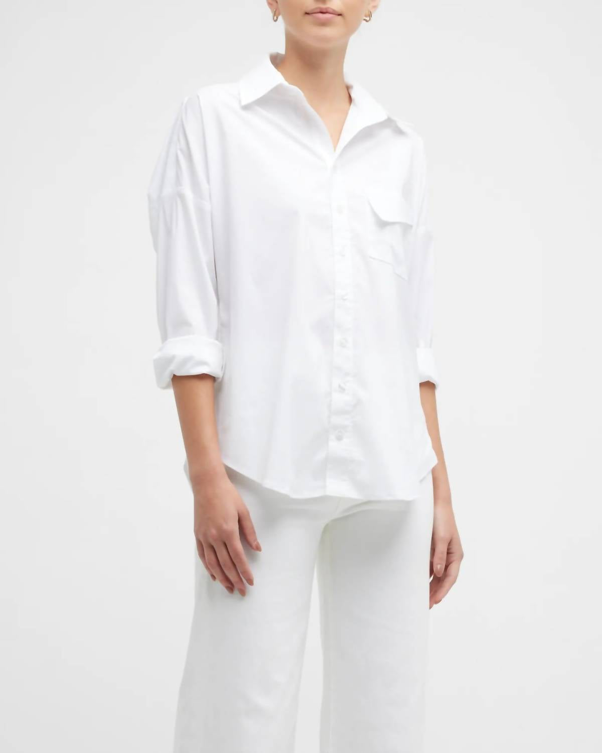 Introducing the Finley Big Boy Boyfriend Silky Poplin Shirt, a minimalist essential in a solid white hue. This shirt features long roll-tab sleeves approximately 24 inches in length and an asymmetric chest flap pocket for added interest. Made from a blend of 60% Cotton, 34% Polyester, and 6% Spandex, this top boasts a relaxed, oversized fit with a spread collar and button closure. Made in the USA, it has a pleated back yoke and a shirttail hem, measuring approximately 27 inches from shoulder to hem, perfect for your holiday party ensemble.