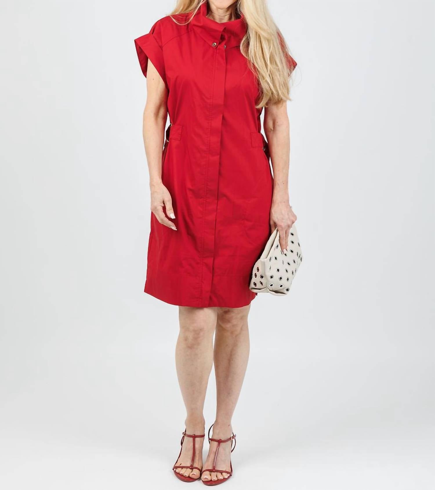 Introducing the Women's Bari Weathercloth Dress by Finley, a chic addition to your wardrobe in Spicy Red. The dress features short cuffed sleeves and is crafted from a cotton blend of 70% Cotton and 30% Polyester, offering a lightweight, structured silhouette. It boasts a stand collar with button detail and a concealed front placket for a clean look, with adjustable side tabs to enhance its tailored shift silhouette. With functional side pockets, this mini-length dress is designed for both style and comfort, making it suitable for any vacation occasion. Model is wearing a size XS (5'6" height, 34" bust, 25" waist, 34" hip).