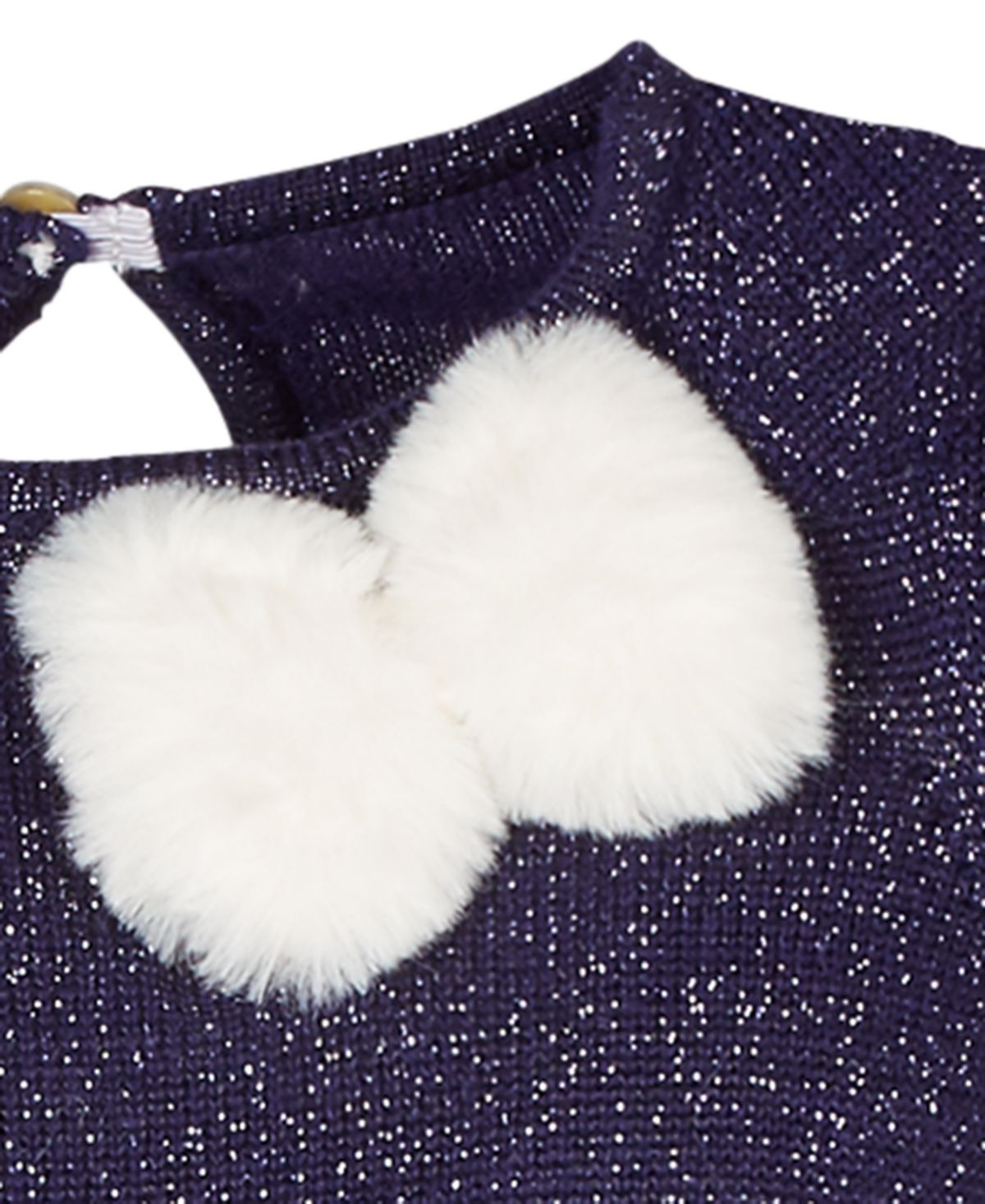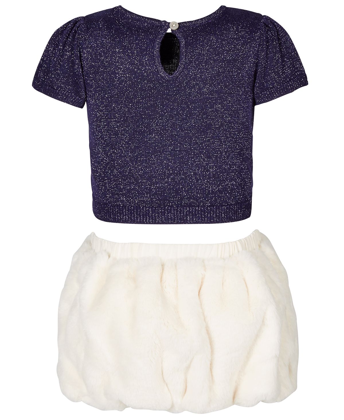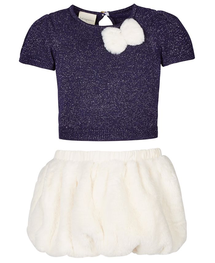 First Impressions creates a totally adorable look with this two-piece set featuring a metallic sweater and fuzzy| faux-fur skirt.| Sweater; crewneck| button closure at keyhole back| faux-fur bow detail at front | Skirt; pull-on design