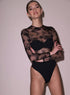 The Bouquet Lace & Jersey Long Sleeve Bodysuit by Fleur Du Mal is a distinguished choice in black, perfect for occasions like anniversaries or Valentine's Day. With luxurious Italian jersey, textured stretch floral leavers lace, and designed with a crewneck, this bodysuit embodies the season's quiet luxury trend. Composition combines 78% Polyamide and 22% Elastane in the lace, with seams of 90% Polyamide and 10% Elastane, featuring a back zipper and a bottom snap closure. Care for this piece with hand washing and laying flat to dry, while the model, 5'10," is seen in a size small, noting the style runs slightly small.