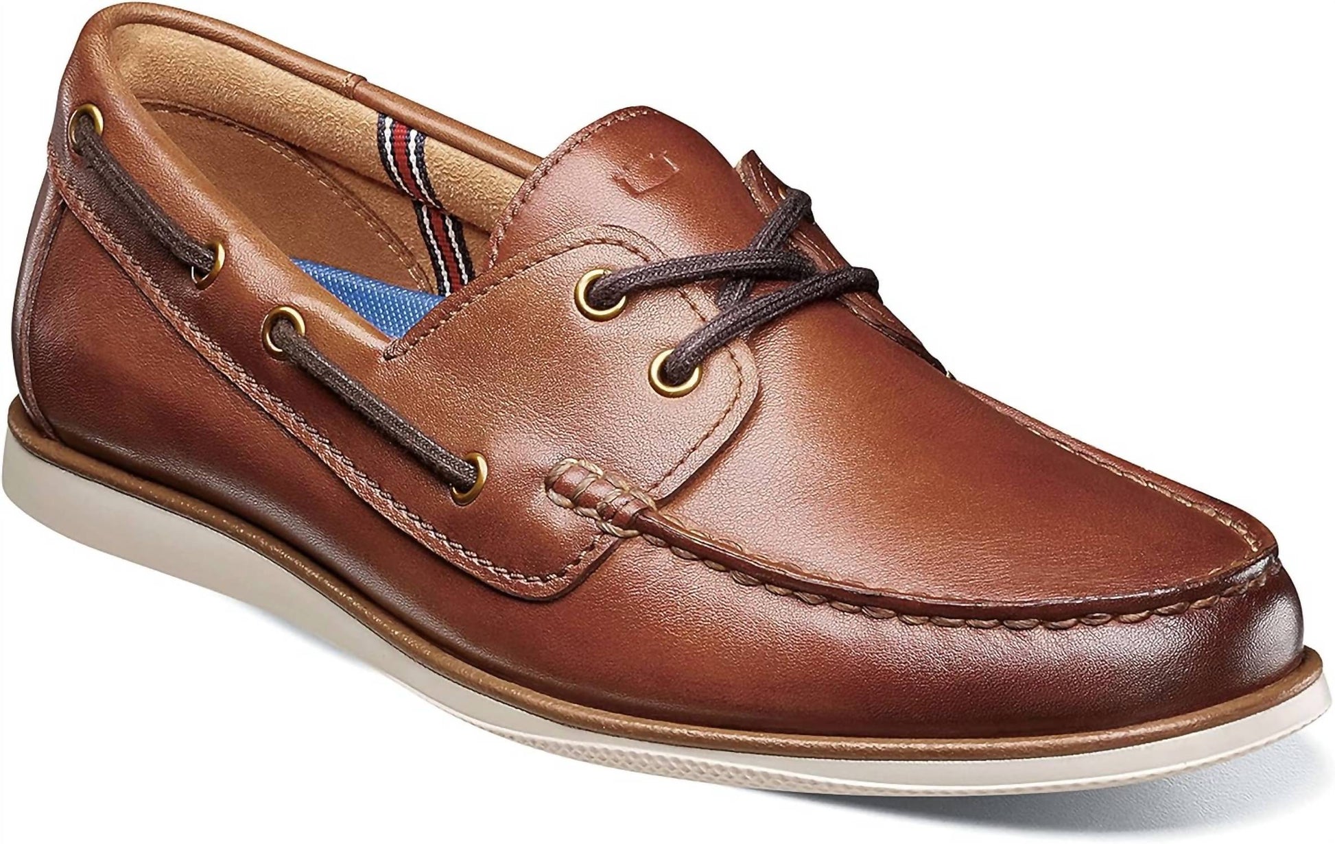 Step into summer sophistication with Florsheim's Men's Atlantic Boat Shoe in a rich cognac hue. Crafted with a leather upper and round moc toe, this shoe exudes a timeless preppy style. It features a lace-up closure and Suedetec lining, ensuring a comfortable fit for any holiday party occasion. The fully cushioned OrthoLite® high-rebound foam footbed offers exceptional comfort and support.