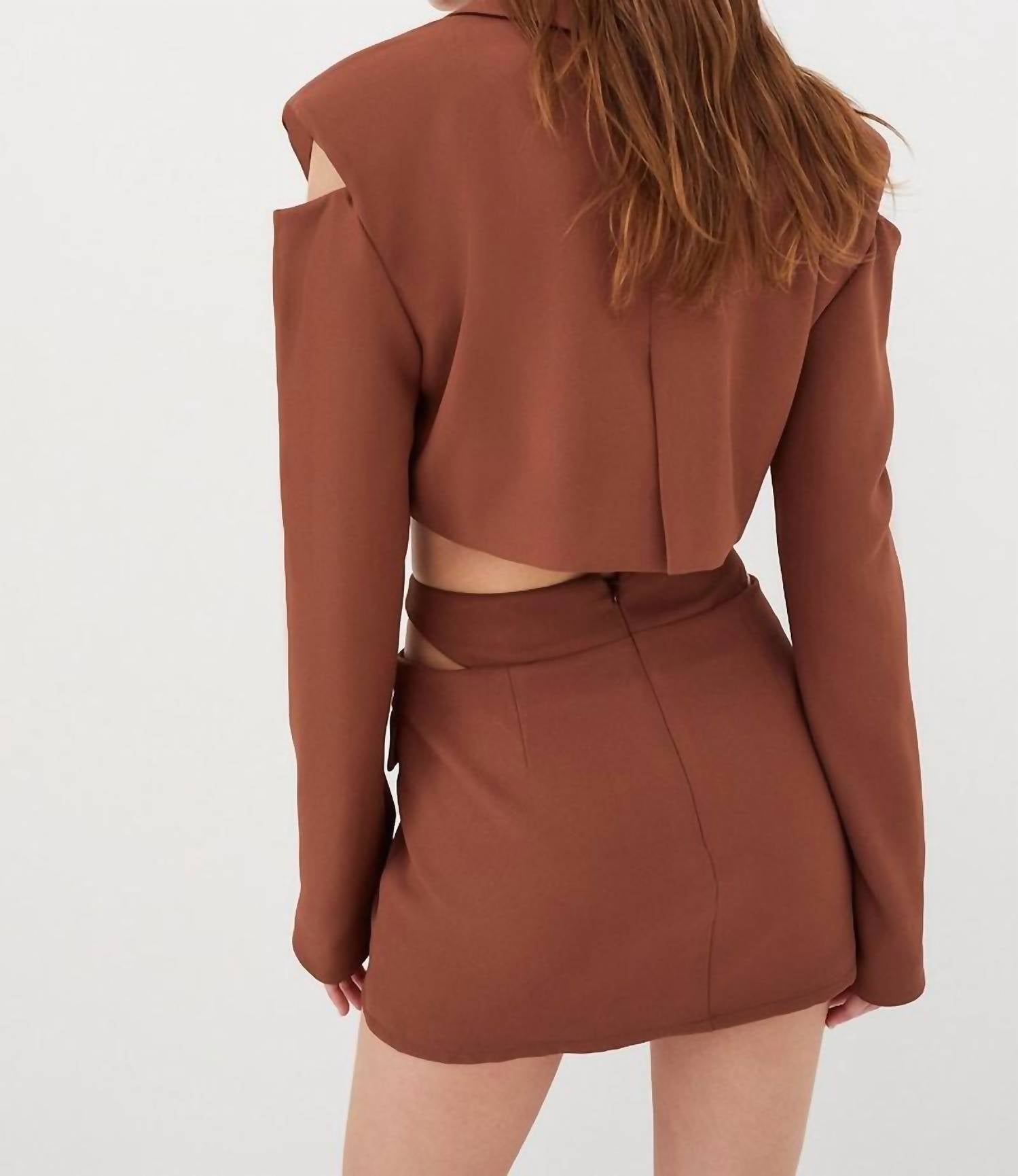 Show a little skin in this cute and casual crop top. Elevate your evening wear with the ALYSA CROP TOP by For Love & Lemons, perfect for a monochrome spring look. This brown crop top features long sleeves and is crafted from lightweight suiting fabric, composed of 100% recycled polyester with a thoughtful lining of 53% Ecovero and 47% rayon. Enhanced by padded shoulders with a cut-out detail, the top secures with a singular front button closure. For maintenance, simply hand wash as per care instructions.