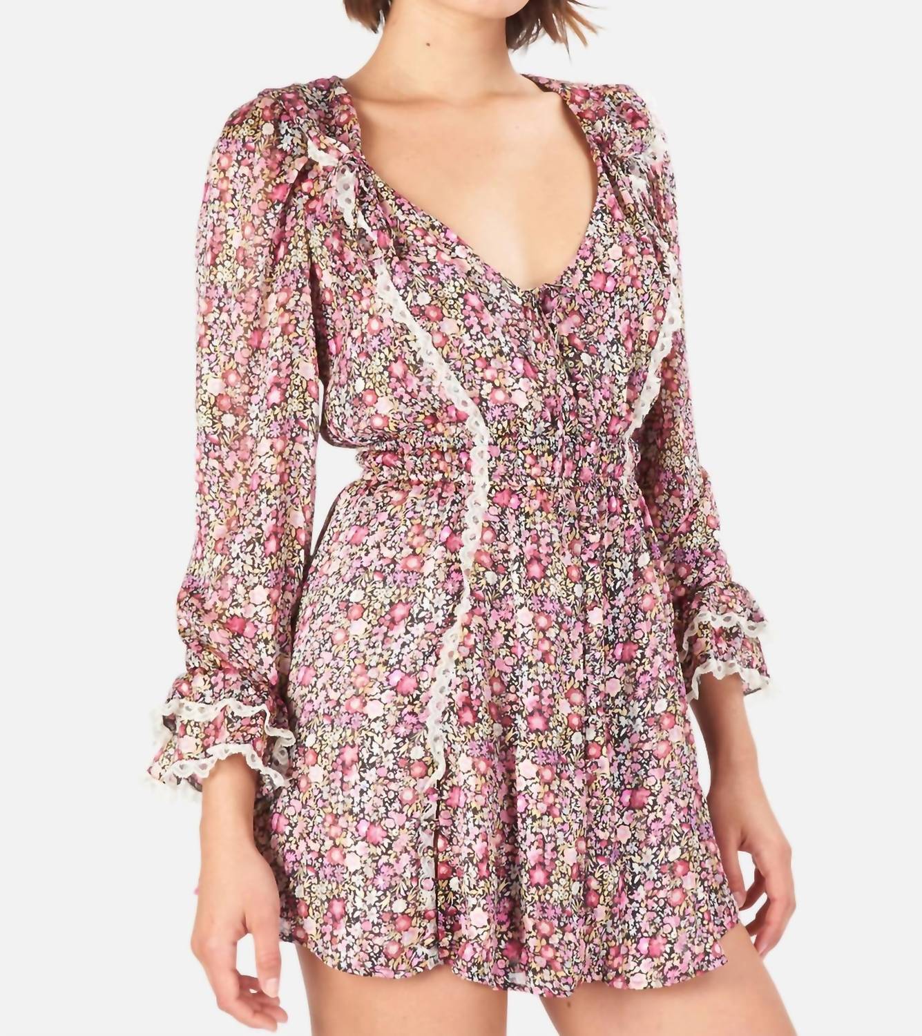 Introducing the Grace Mini Dress by For Love & Lemons, a boho-chic dream for spring evenings in a vibrant floral pattern. This women’s mini features long sleeves with ruffle elastic cuffs and alluring tie accents at the V-neckline. Crafted from 100% recycled polyester with elegant Lurex threading details, it is fully lined and adorned with lace trim throughout. The dress boasts a smocked elastic waistband and a front loop button closure for a flattering A-line silhouette. Care: Machine wash and tumble dry.