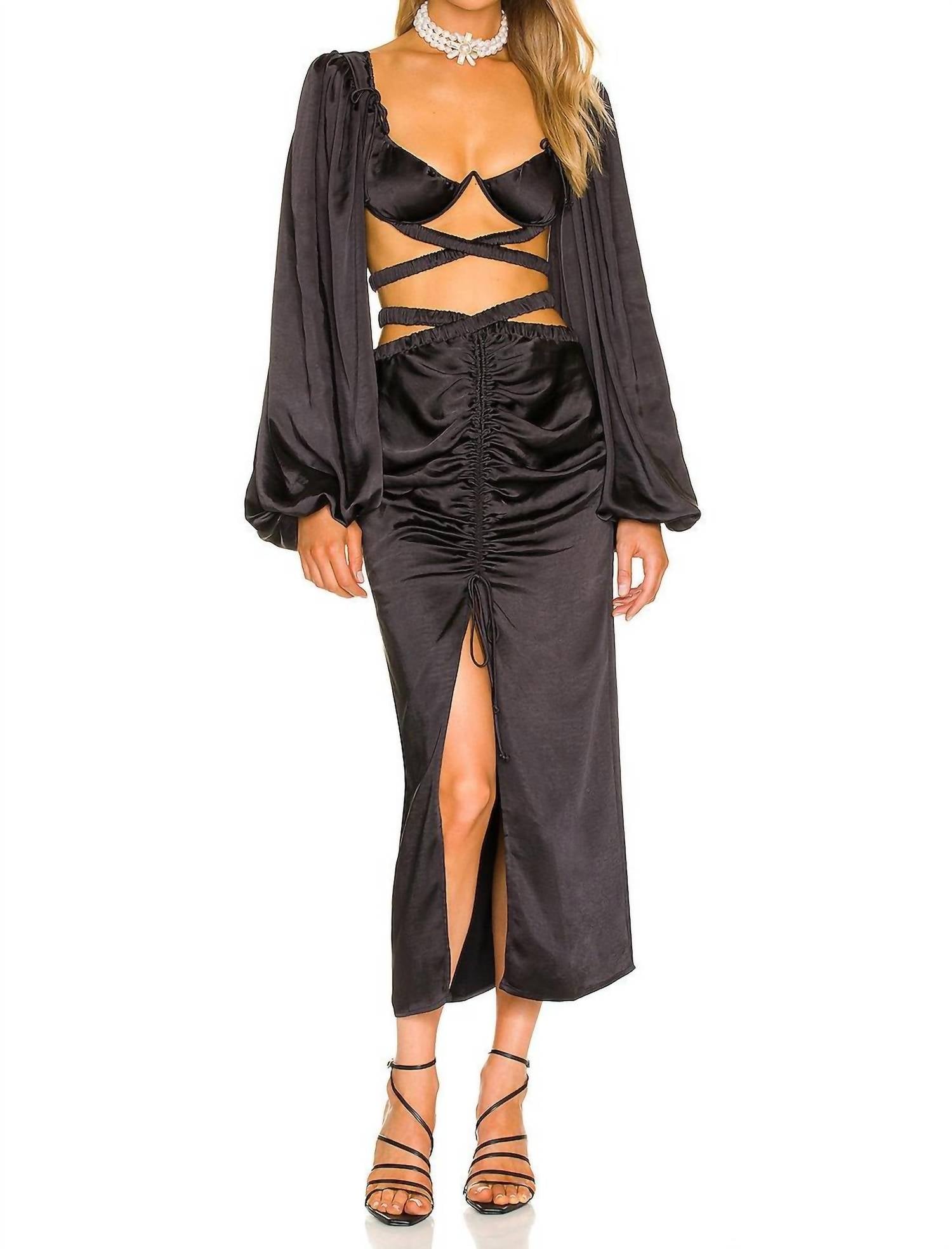 Introducing the Pia Midi Skirt by For Love & Lemons, a chic monochrome piece perfect for spring engagements and New Year's Eve celebrations. This black midi skirt is crafted from 100% recycled polyester satin, featuring a ruched drawstring front, a hem slit, and a scrunched elastic accent strap with an s-hook closure. It also includes a hidden back zipper closure with ruched detail to ensure a sleek fit. Care for this solid-patterned piece with dry cleaning only.
