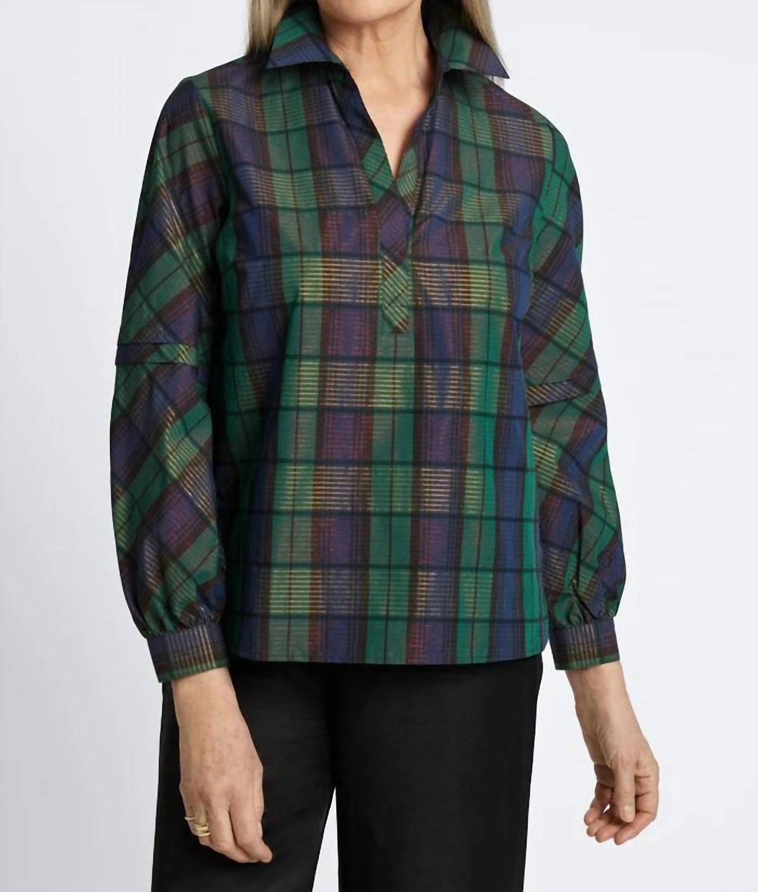 Discover the Frankie Popover Shirt by Foxcroft, an elegant choice in Metallic Plaid designed to elevate your spring wardrobe. This blouse features long sleeves with double pleats leading to a bloused, double-button cuff for a playful touch. Composed of 65% cotton, 30% polyester, and 5% spandex, it offers a comfortable stretch bonded with no iron polish. Closure: Pull-on style. Ideal for church, this top pairs sophistication with easy care.