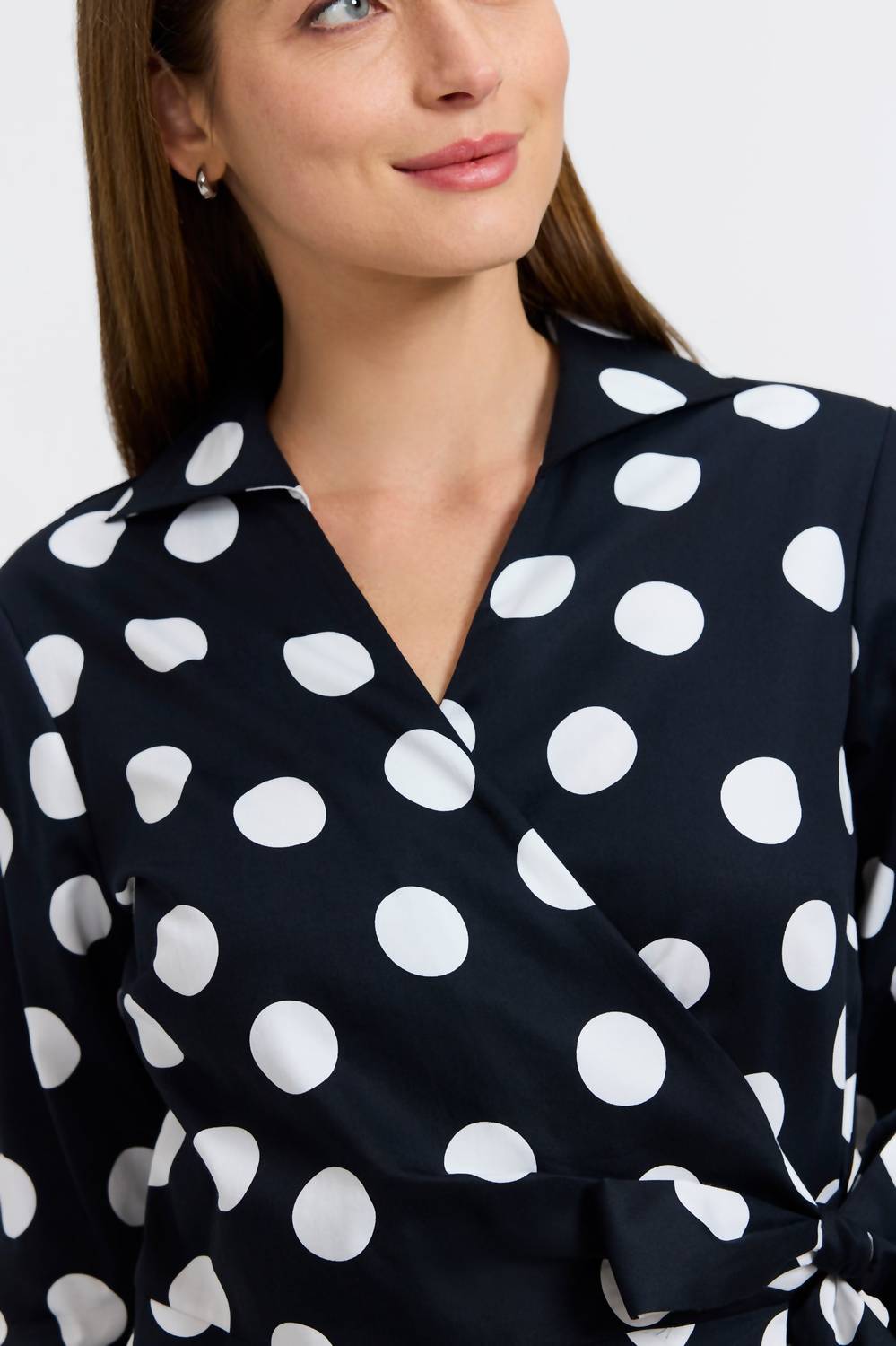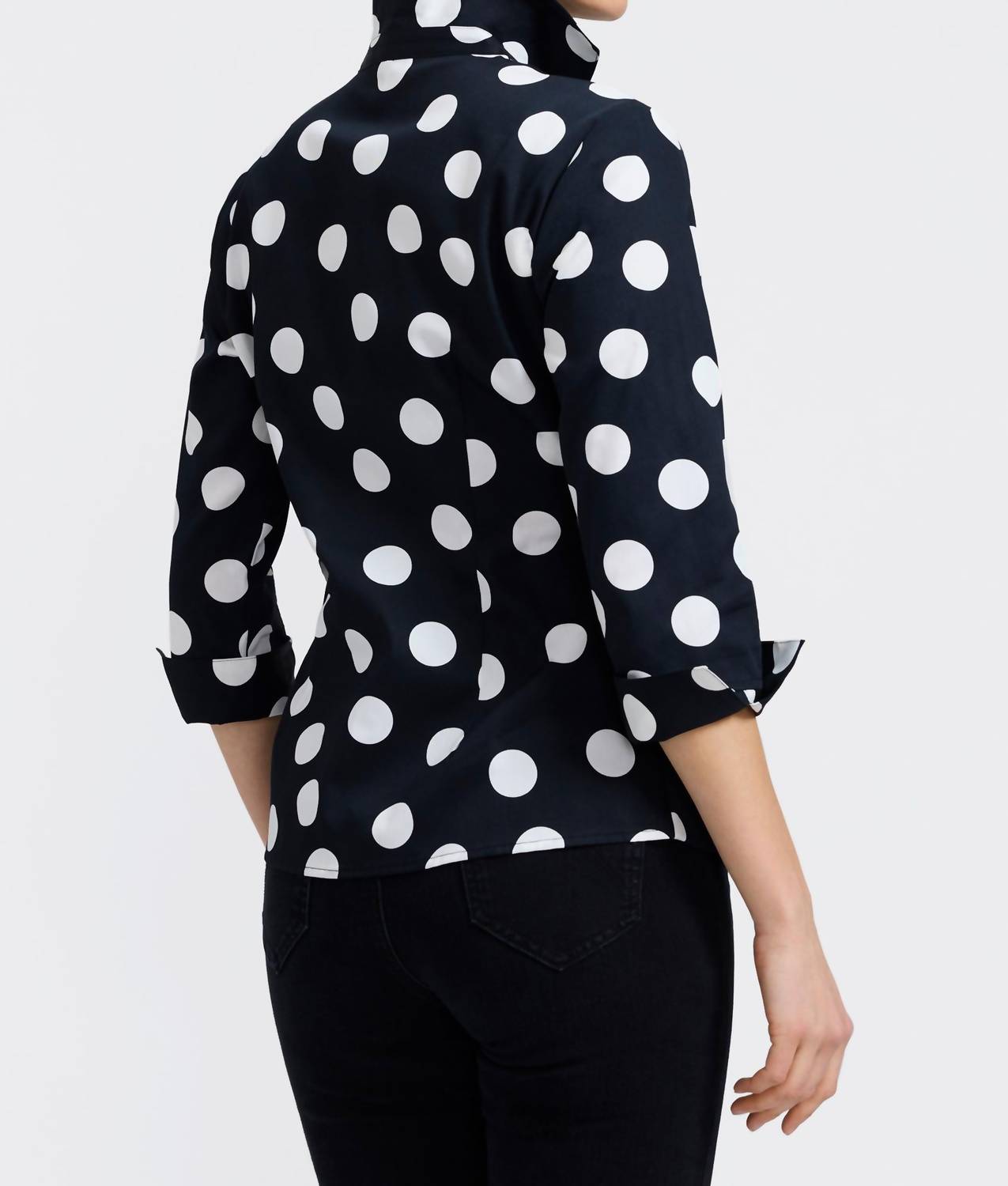 Pair this with your favorite jeans and slides for your next girls night out. Elevate your wardrobe with the Women's Salina Polka Dot Three Quarter Sleeve Top by Foxcroft. This chic blouse showcases a bold oversized polka dot pattern in classic black and white, perfect for a standout spring look. It features a flattering V-neck with a wing collar, wrap front, and three-quarter sleeves with signature flip-up cuffs, all complemented by a convenient internal adjustable tie for a personalized fit. With a straight hem and 25-inch center back length on a size S, this top offers all-day comfort and a beautifully structured drape. Closure: Tie closure.