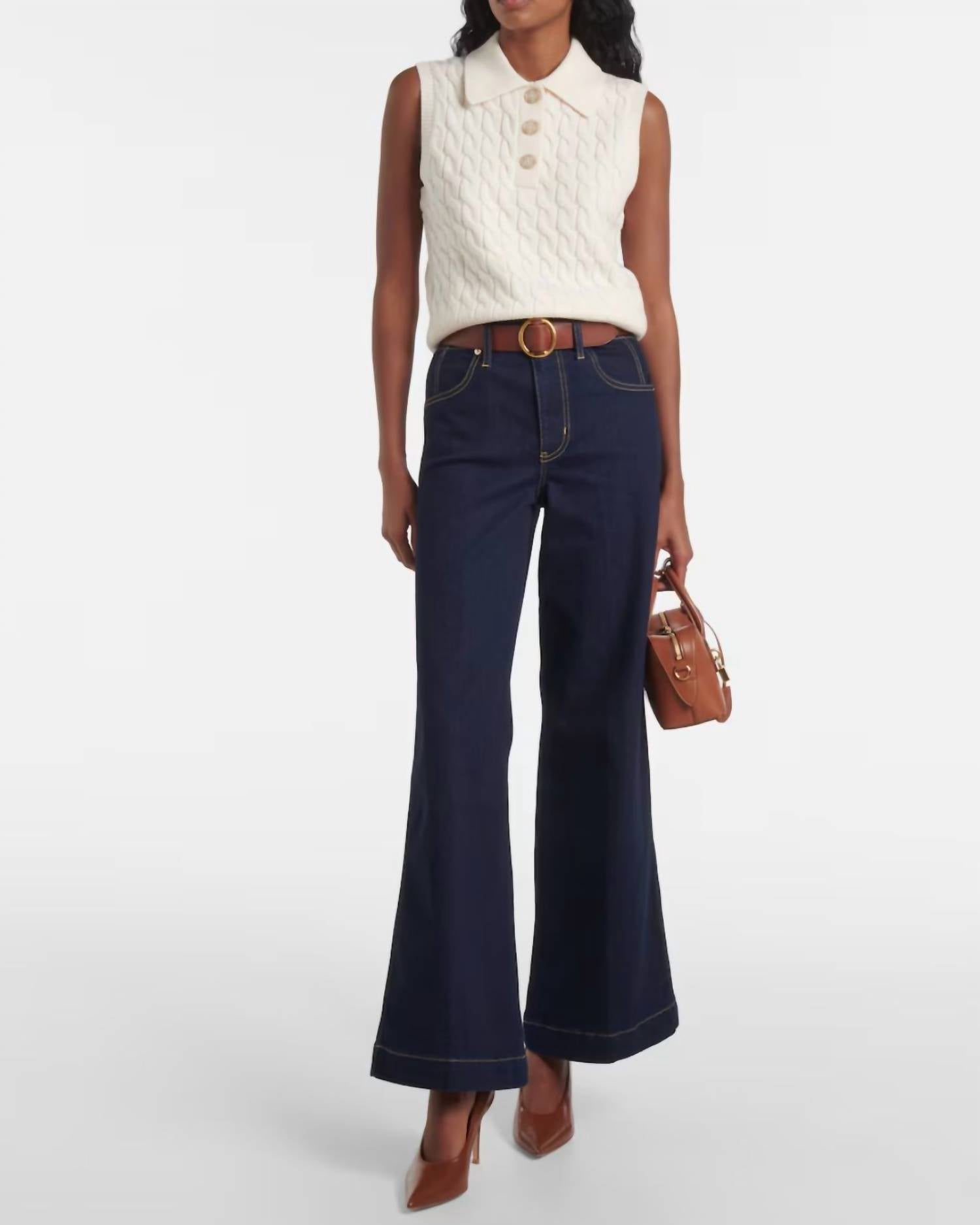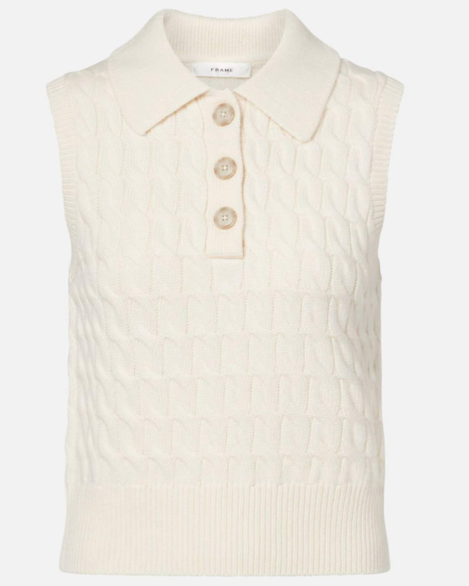 Pair this with your favorite jeans and slides for your next girls night out. Introducing the Cable Polo Wool Sweater Vest by FRAME, a chic addition to any summer wardrobe in a sophisticated cream hue. Designed with a charming collar and featuring a partially button-down closure, this sleeveless vest showcases a beautiful textured pattern perfect for vacation settings. Crafted from 100% wool, this stylish piece is made in China. Care: Dry clean only.