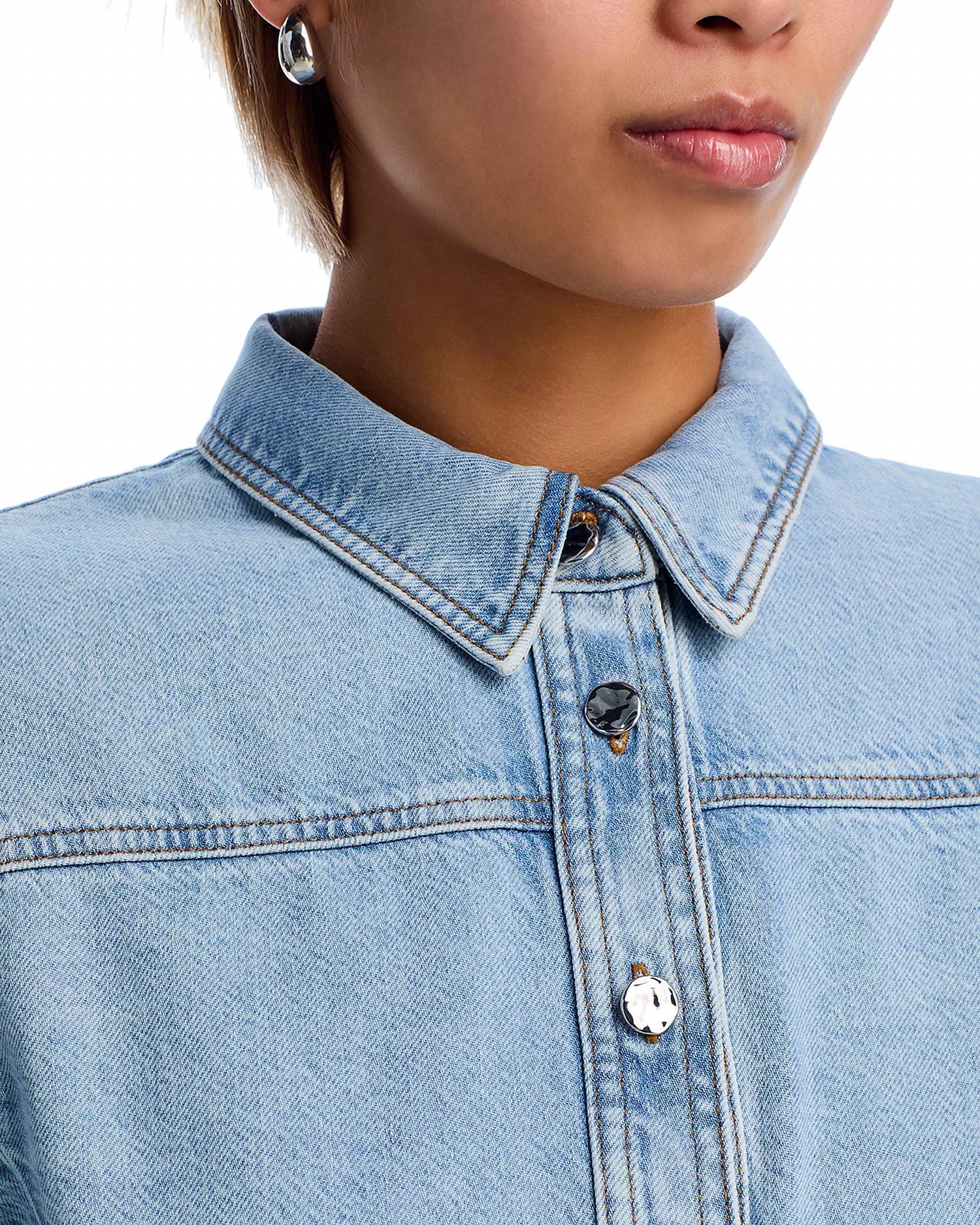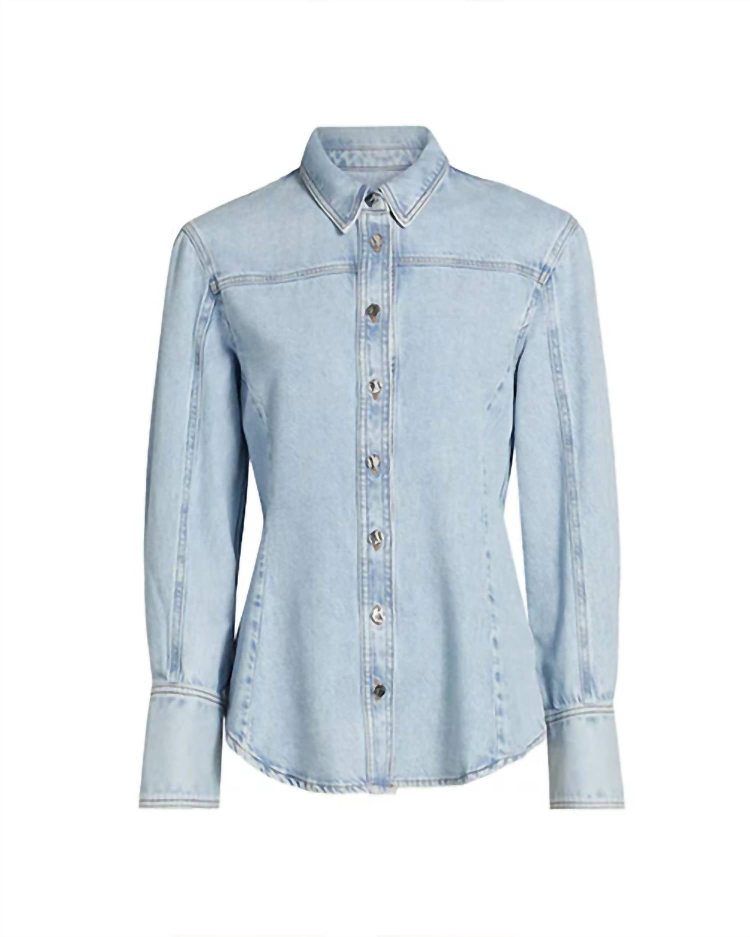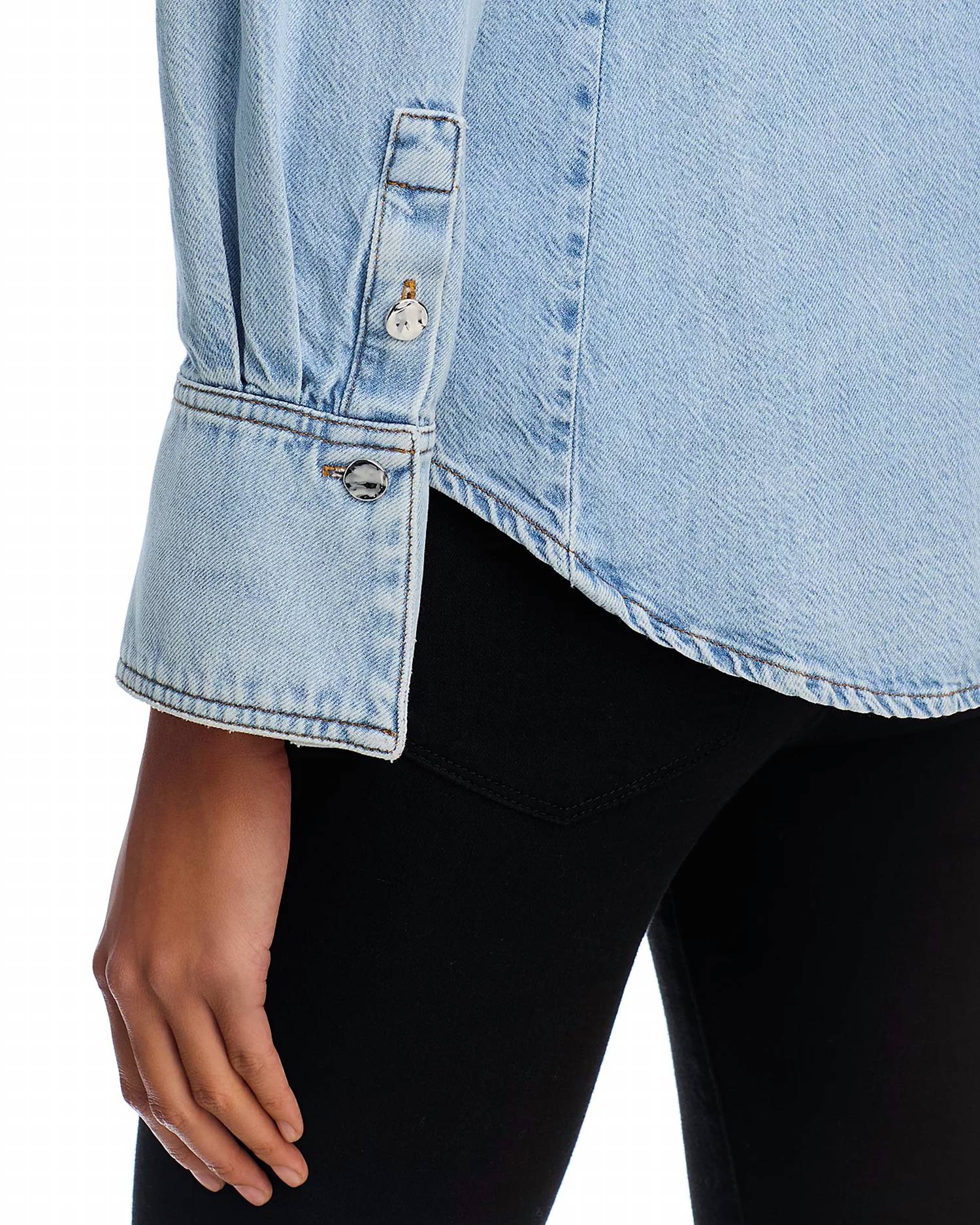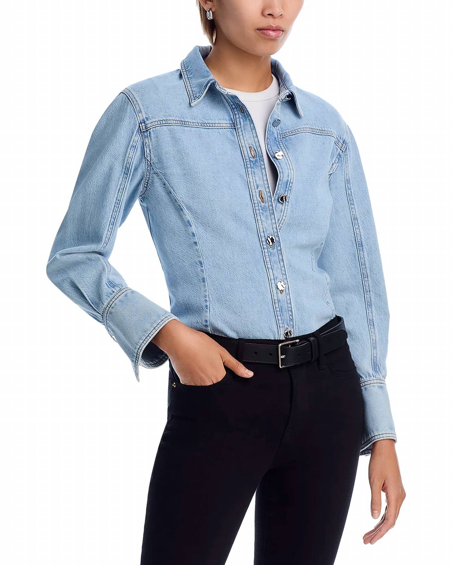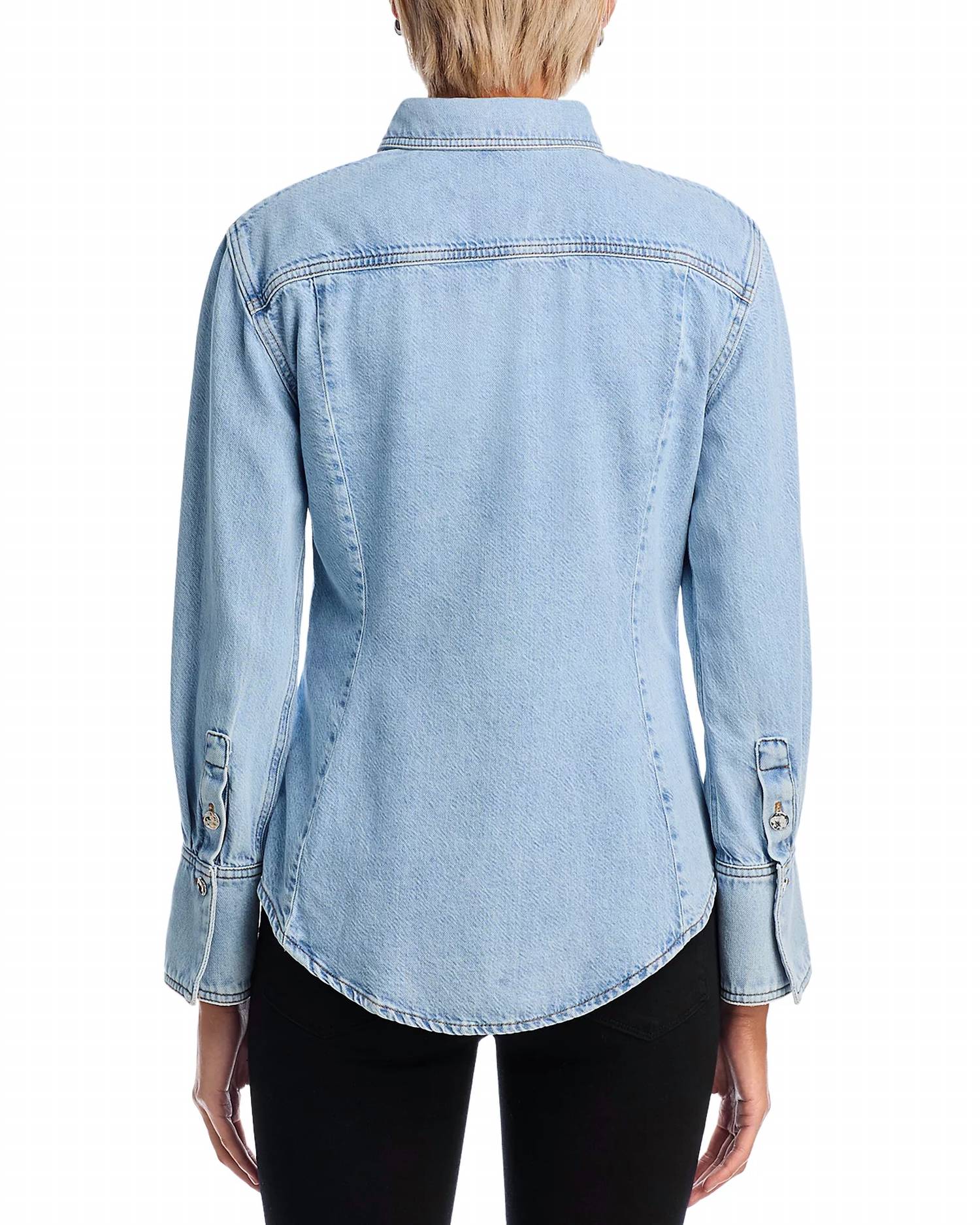 Perfectly tailored and soft to the touch. Discover the sophisticated style of FRAME's Curved Denim Shirt, perfect for travel and adaptable to any wardrobe. This women's shirt in Shimmy features long sleeves with button-barrel cuffs and a cutaway collar, alongside a chic curved hem for an elevated look. Crafted from a cotton blend of 64% cotton and 36% lyocell, it ensures both comfort and durability. Closure is a button-front style, and it's easy to care for with machine wash instructions.