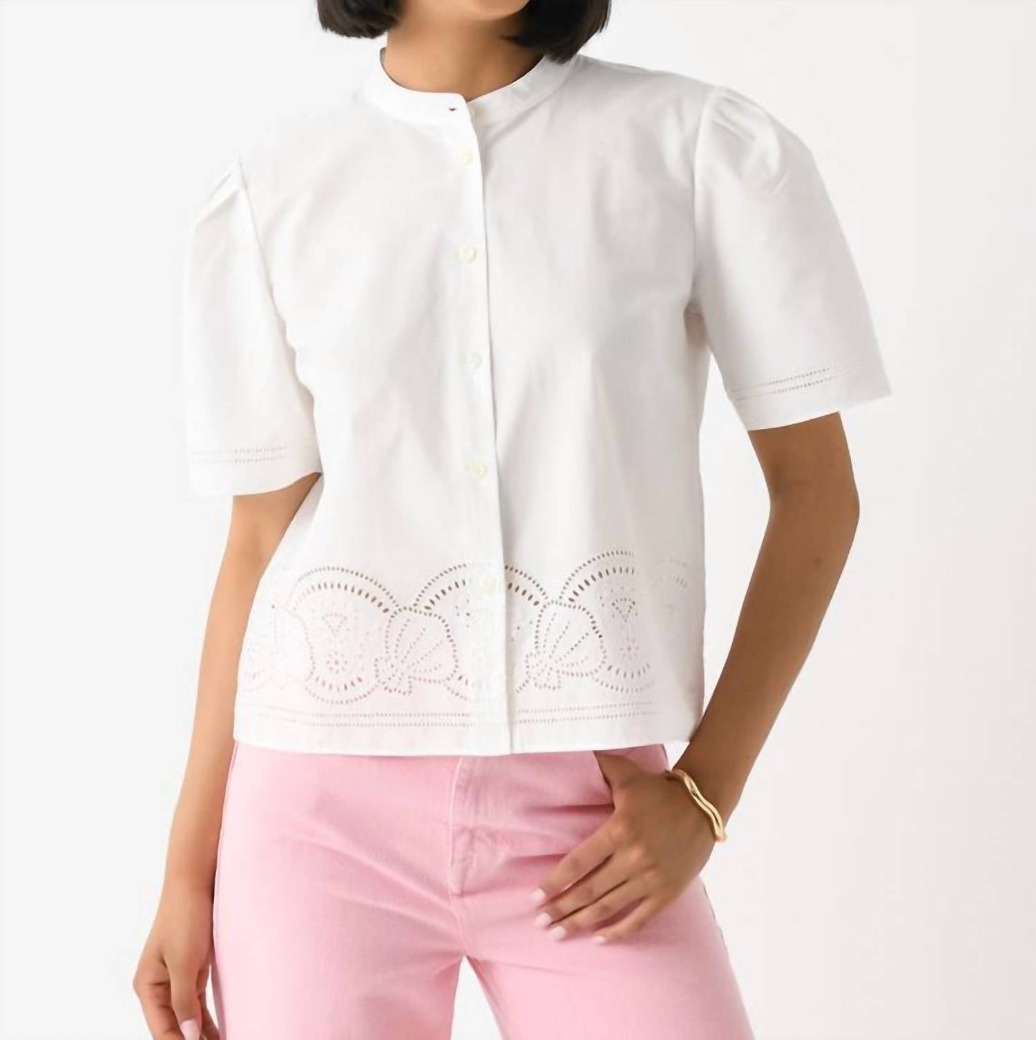 A classic button down shirt that will never go out of style. Embrace coastal charm with Frame's Embroidered Short Sleeve Shirt in White, featuring delicate coastal-inspired eyelet embroidery. Crafted from lightweight cotton fabric, this shirt offers a breezy and breathable feel, perfect for warm-weather days. With its relaxed silhouette and elegant design, it effortlessly transitions from casual outings to more dressed-up occasions. Pair it with your favorite denim for a relaxed daytime look or dress it up with tailored pants for a chic ensemble that exudes effortless sophistication.Fabrication: 100% Cotton PoplinDetails:- Short sleeves- Pleated shoulders- Coastal-inspired eyelet- 22" long from shoulder