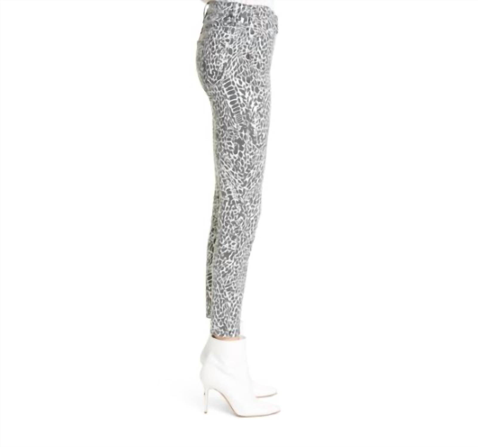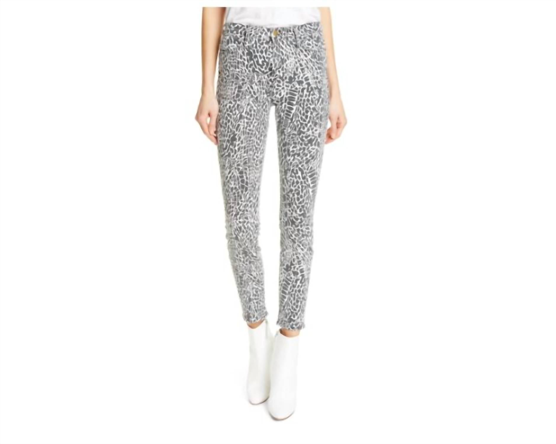 Everyone needs a good pair of skinny jeans and this is a style you'll keep reaching for no matter the season. Unleash your wild side with the FRAME Le Skinny Animal Print Jeans, a daring addition to any wardrobe. These high-waisted jeans feature a chic, abstract animal print in a classic black and white palette, paired with a figure-sculpting skinny fit. Crafted from a blend of 92% cotton, 6% polyester, and 2% elastane, these jeans promise comfort and durability. They're equipped with a zip fly and button closure and boast a contemporary five-pocket style, made in the USA from premium imported fabric. Offering an inseam of 28" and a high rise of 9.5", these jeans are as flattering as they are stylish. Perfect for any occasion, they pair effortlessly with your favorite tops. Machine wash and tumble dry for easy care.