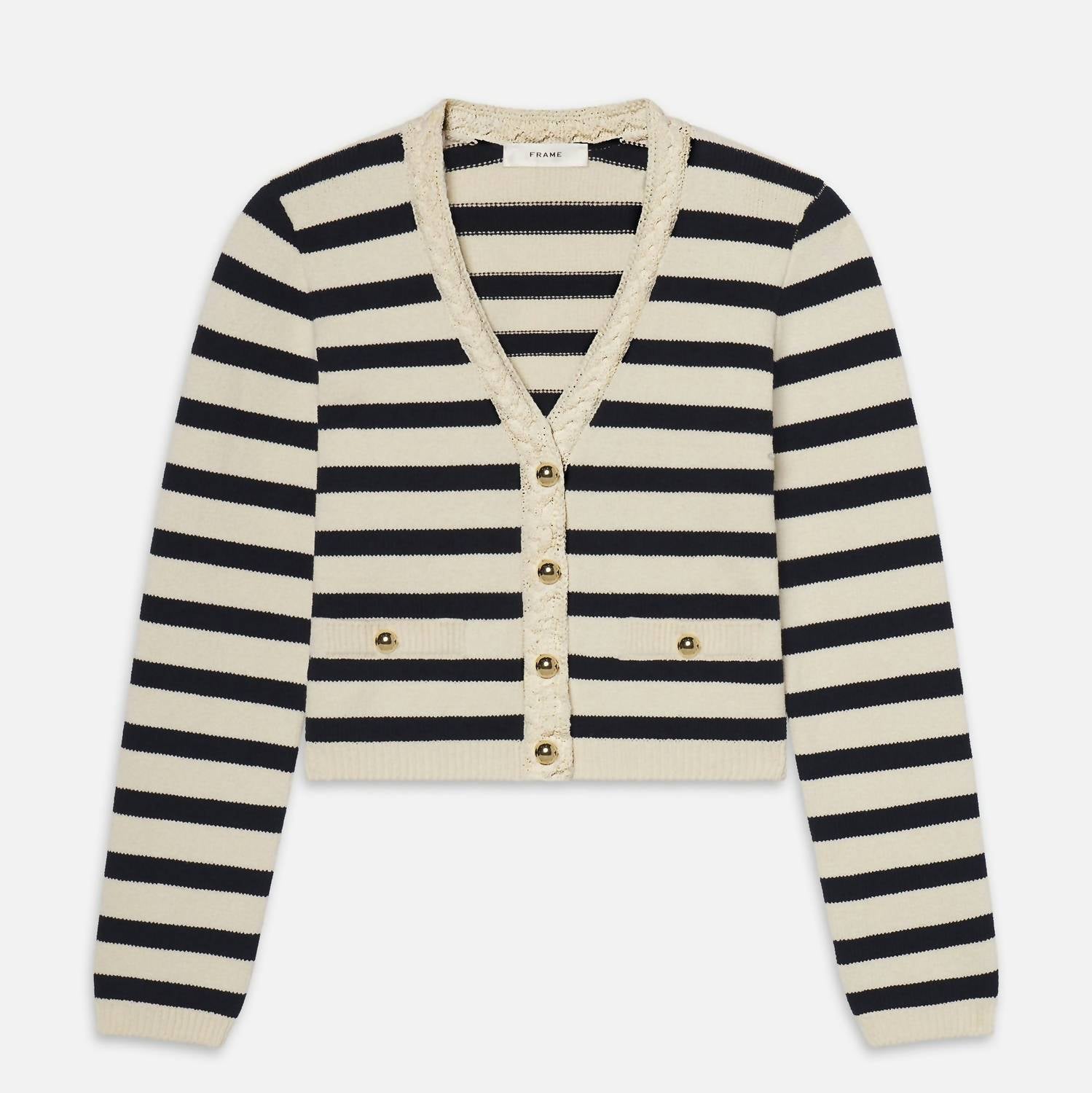 This cardigan will be a sweater-rotation favorite. Elevate your fall wardrobe with the FRAME Harbor Stripe Cardigan, a chic piece in Navy Multi adorned with braided trim and gold buttons. This cardigan features long sleeves and a classic V-neckline, combining the charm of navy-and-cream stripes with a minimalist touch. Composed of a Cotton Blend, the slightly cropped design measures 18.5 inches long. Made with a button closure, this women’s garment is the perfect addition to your Thanksgiving and holiday party outfits. Care instructions recommend dry cleaning to maintain its timeless appeal.