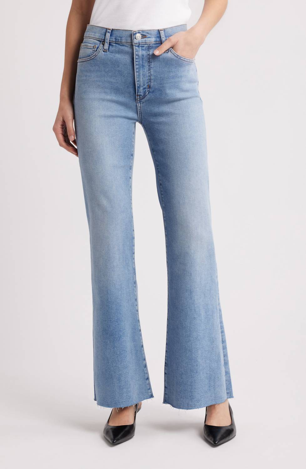 Pair these wide leg jeans with mules, slides or your favorite strappy sandals. Introducing the Icon Raw Hem Flare Jeans by FRAME, perfect for a vintage-inspired look with a modern twist. These hip-hugging jeans feature a high rise with a 10" front rise, a 31" inseam, and a 22" leg opening, crafted from a super-stretch cotton blend that includes recycled fibers. The full-length, raw hem is ideal for pairing with a heel, and the jeans are styled with a classic five-pocket design and a zip fly with button closure. Not only are these imported jeans made for comfort and flexibility, but they also offer easy care—just machine wash cold and lay flat to dry.