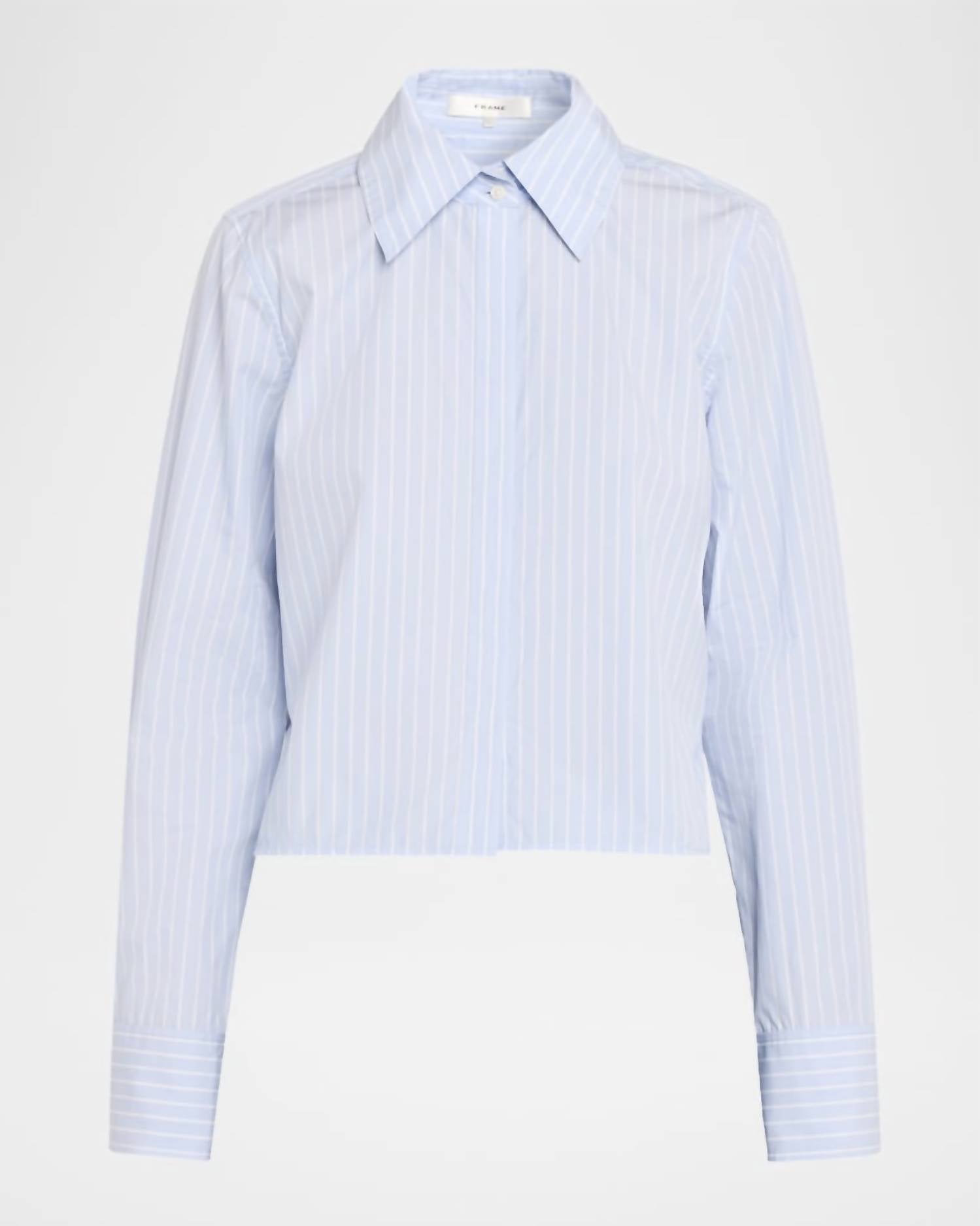 Perfectly tailored and soft to the touch. Elevate your wardrobe with the Modern Collar Shirt by FRAME, an essential piece in Oxford Blue Multi. This cotton button-down features a sleek pinstripe design and long sleeves, complete with a point collar for a refined look. The concealed button-front adds an element of sophistication to its classic fit, and the side slits offer a touch of modernity. Care instructions: Dry clean only. Crafted with precision and imported.