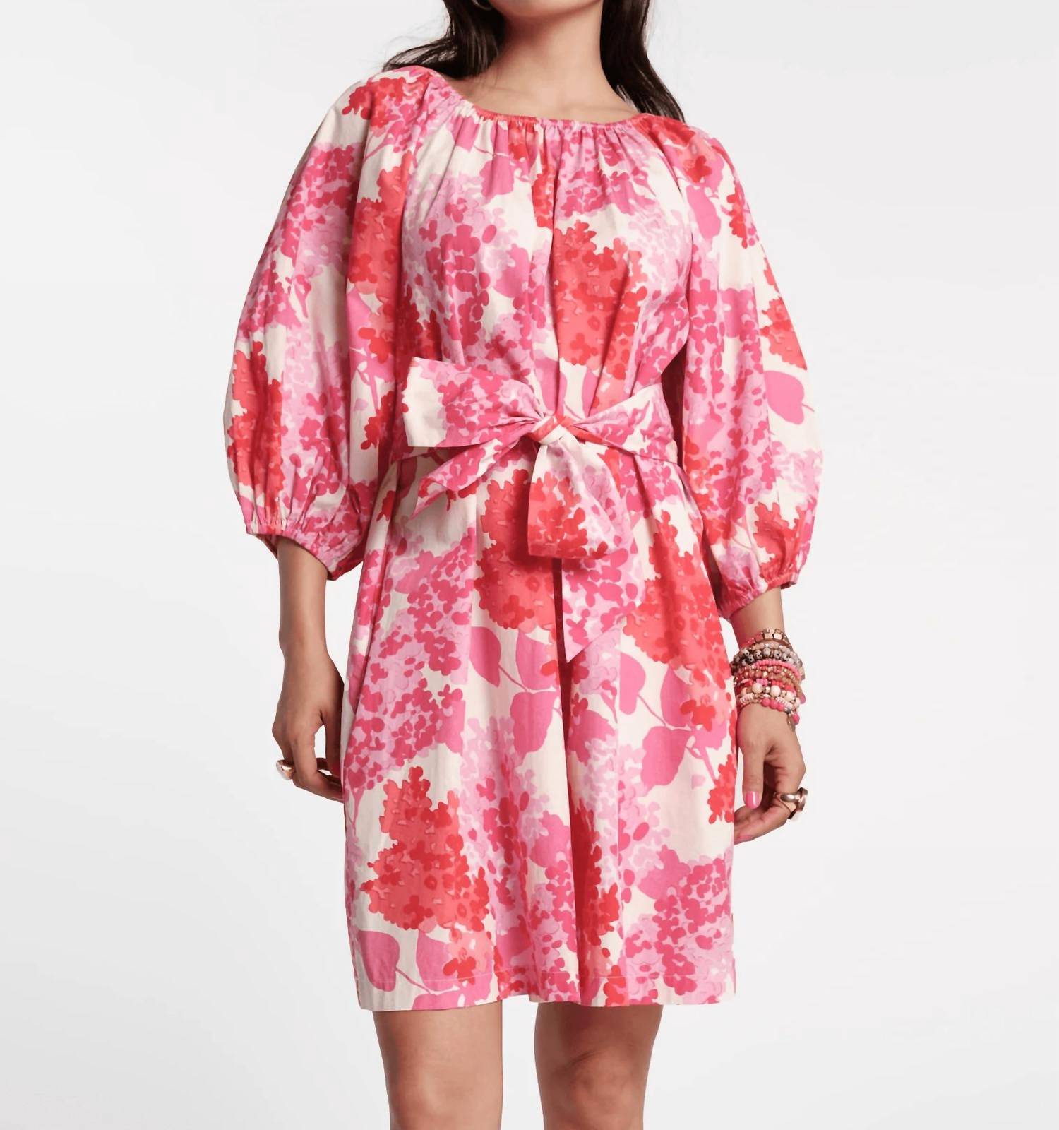 The Bliss Hydrangea Dress by FRANCES VALENTINE is a delightful addition to your wardrobe, perfect for spring occasions or a Mother's Day celebration. This boho chic, fit and flare mini dress features long sleeve balloon sleeves and a stylish boatneck, crafted from 100% crisp cotton poplin. Designed with an adjustable fit, it includes a removable belt and elastic hems for styling versatility. Made in India with a pull-on closure, this floral pink and orange dress is conveniently machine washable and tumble dry friendly.